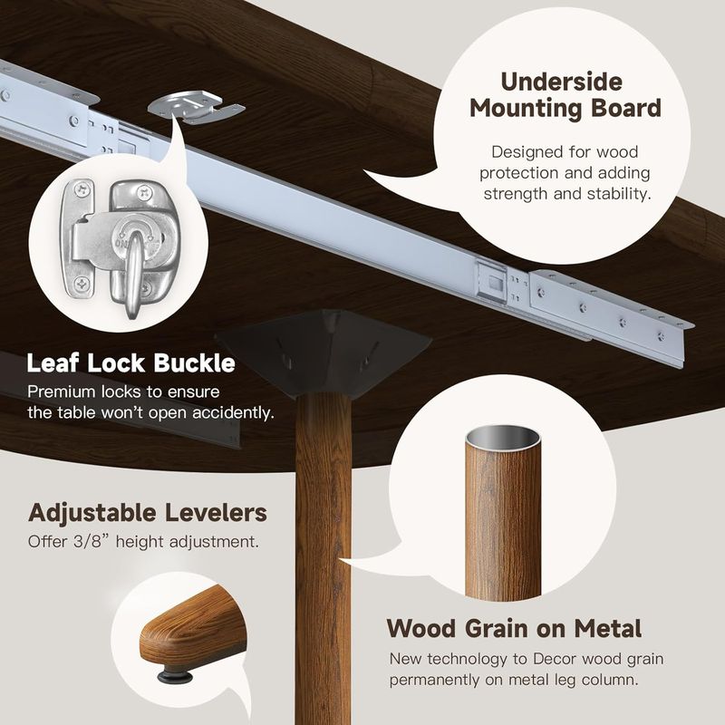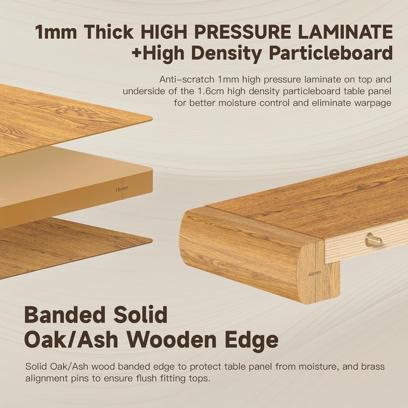The table is equipped with 1mm scratch-resistant and heat-resistant High Pressure Laminate on the top surface, effectively protecting the wooden panels from damage caused by external forces, utensils, moisture. The same material is used on the bottom surface to provide a balanced construction and eliminating any warpage. The extension mechanism and mounting plate at the base are installed on the laminate board to enhance better stability and durability of the table.