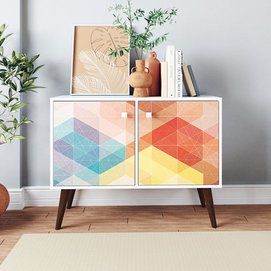 Manhattan Comfort Funky Avesta Side Table 2.0 with 3 Shelves in a White Frame with a Colorful Stamp Door and Yellow Feet