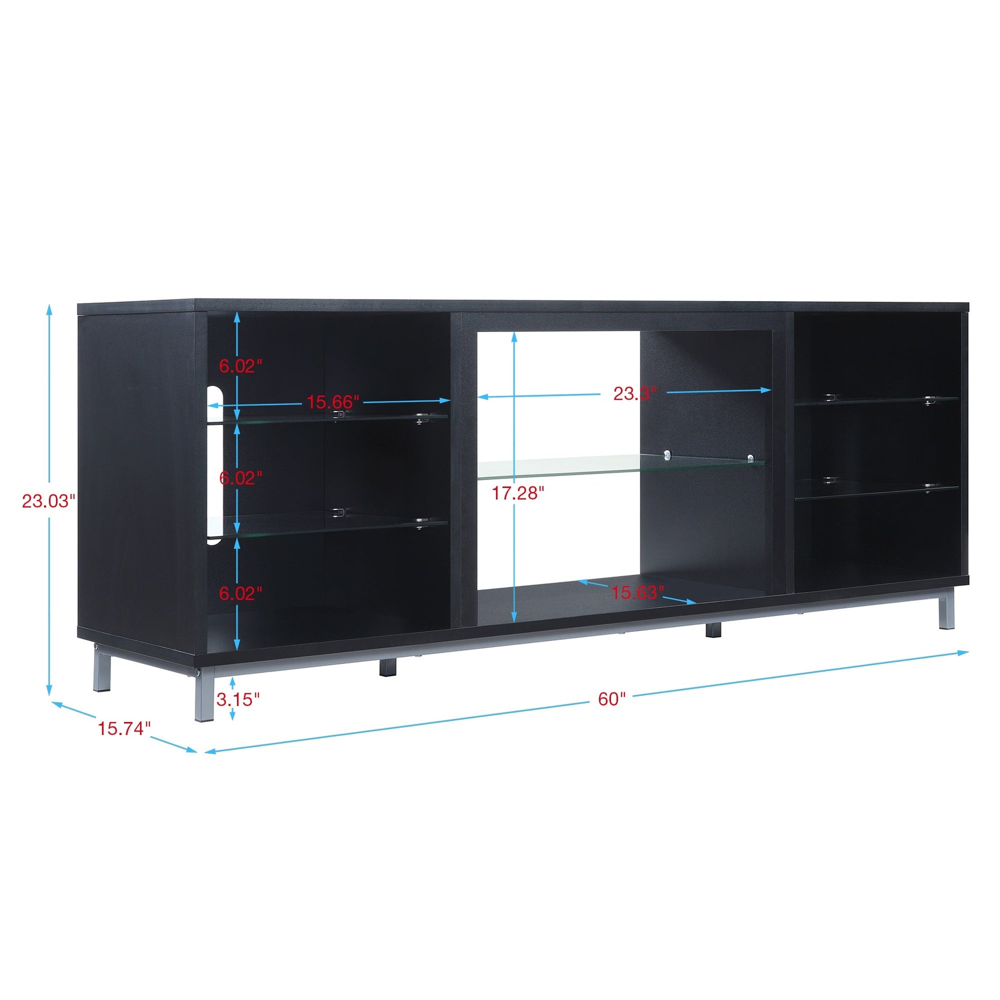- Upon assembly, TV Stand Dimensions Measure: 60 in. Length, 24 in. Height, 16 in. Depth.