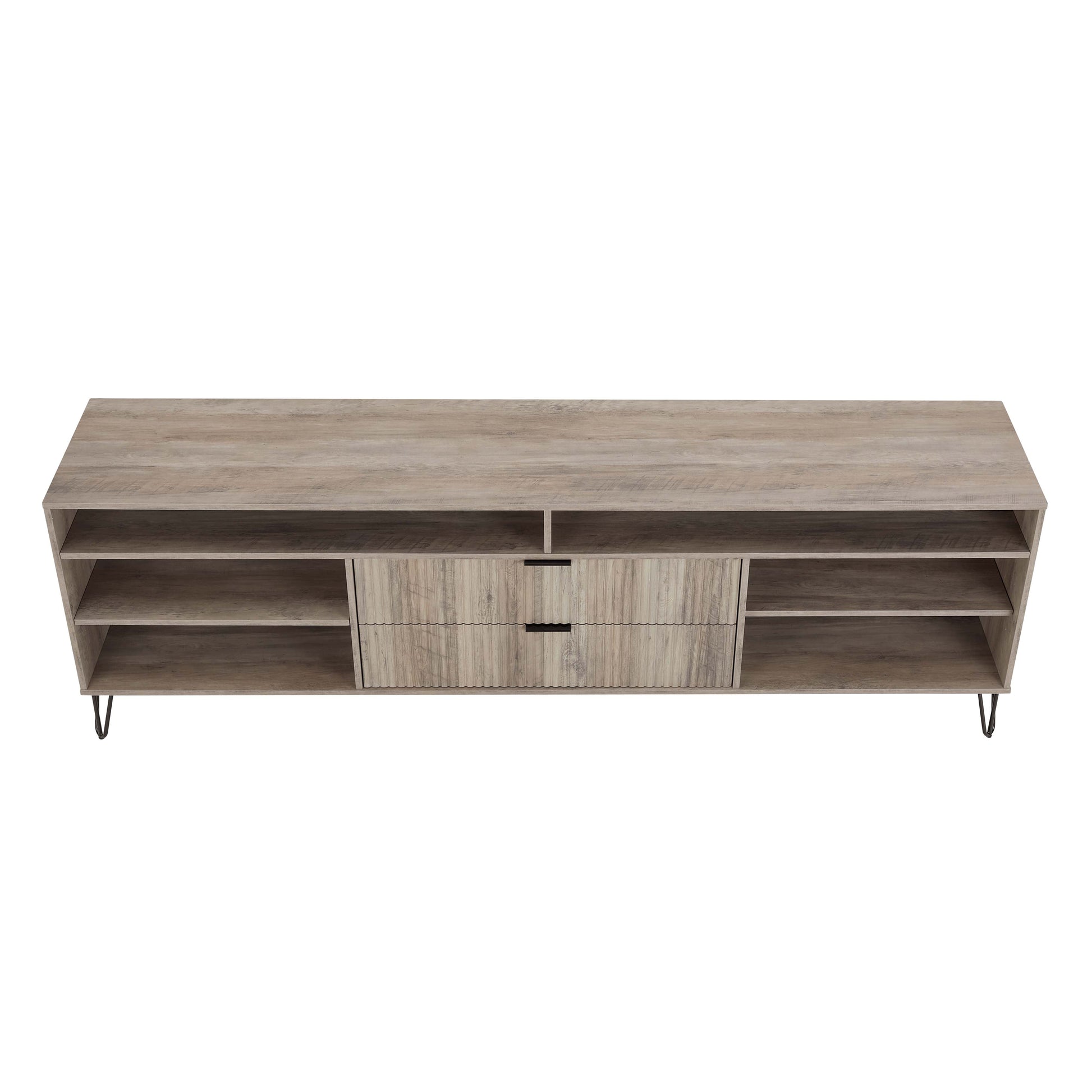 - Upon assembly, TV Stand Dimensions Measure: 85 in. Length, 26.77 in. Height, 17.99 in. Depth.