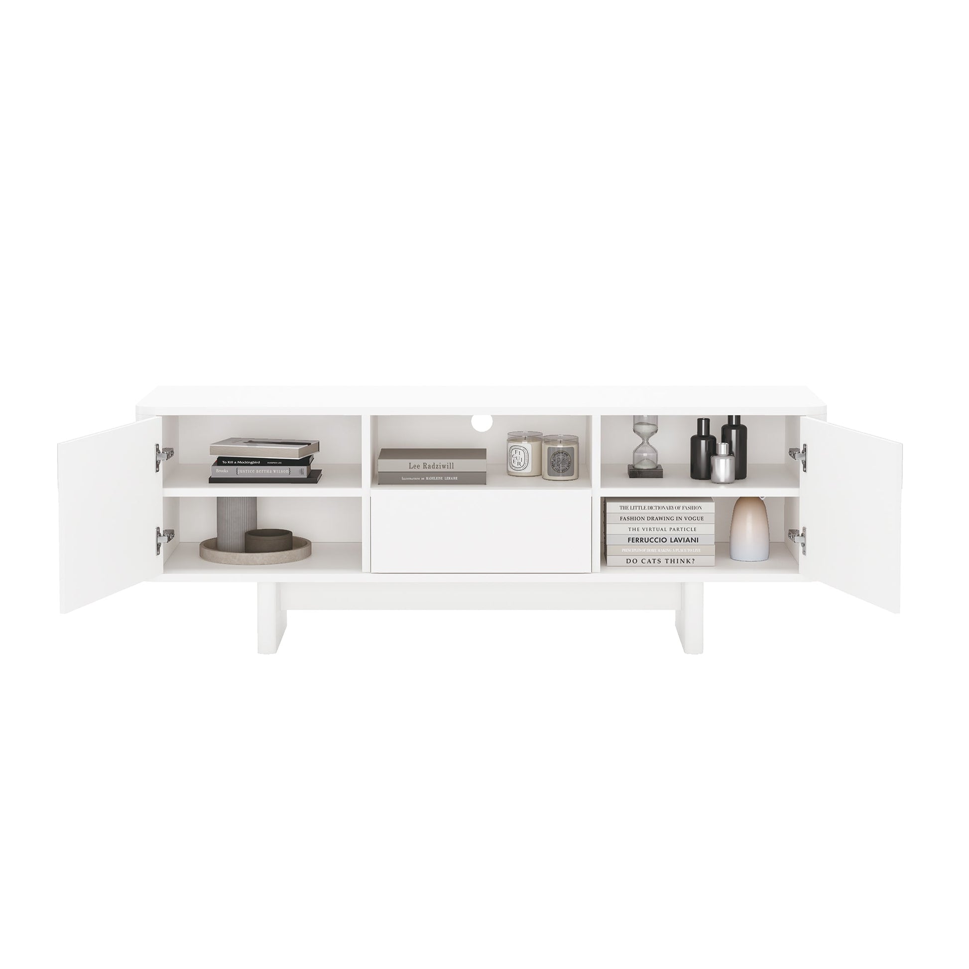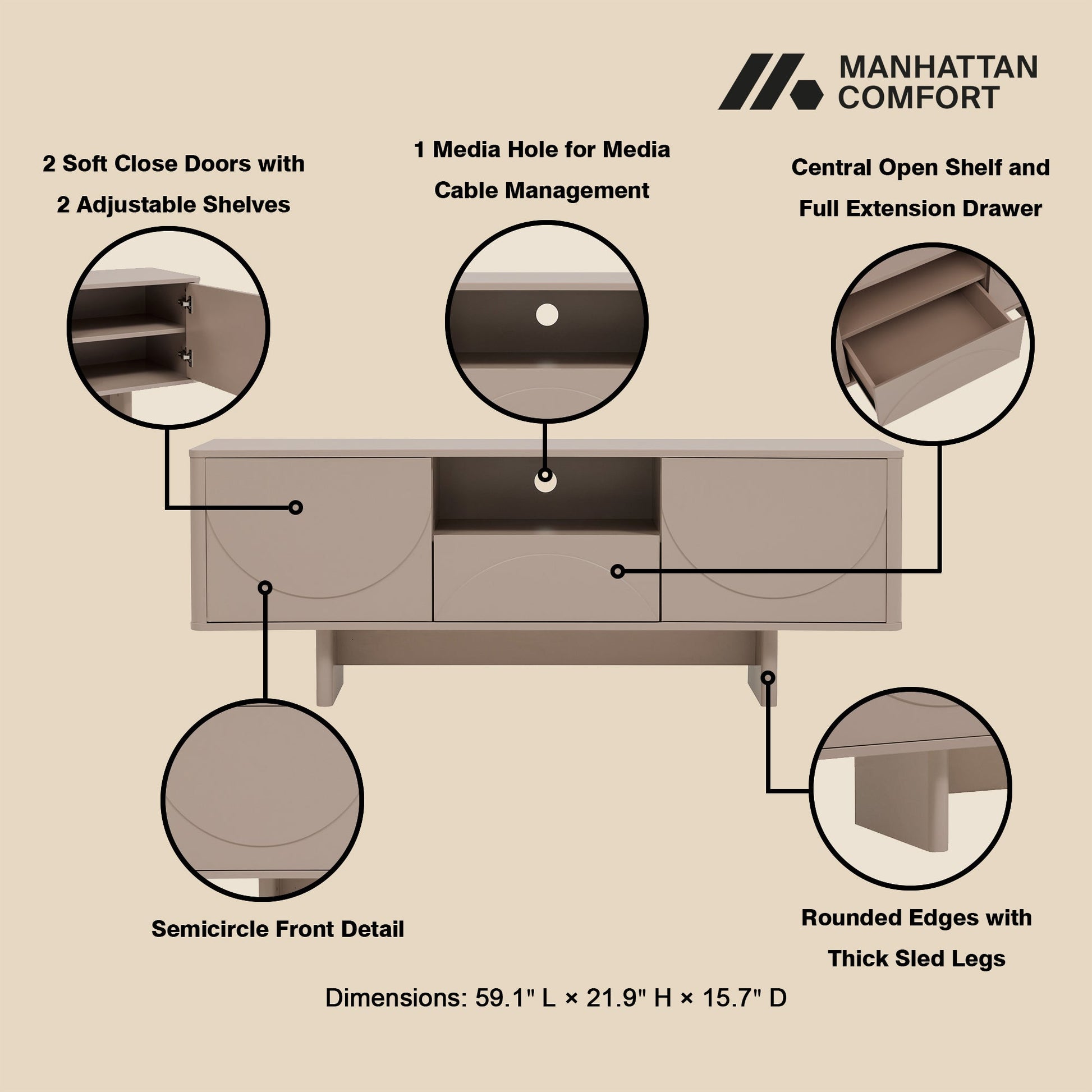 - Upon assembly, 59" TV Stand Dimensions Measure: 59.1 in. Length, 21.9 in. Height, 15.7 in. Depth.