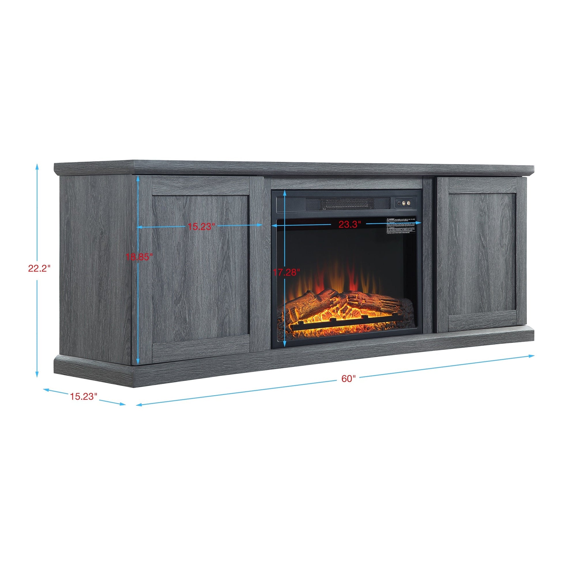 - Upon assembly, Electric Fireplace Dimensions Measure: 23 in. Length, 17.1 in. Height, 5 in. Depth. TV Stand Dimensions Measure: 60 in. Length, 22 in. Height, 15 in. Depth.