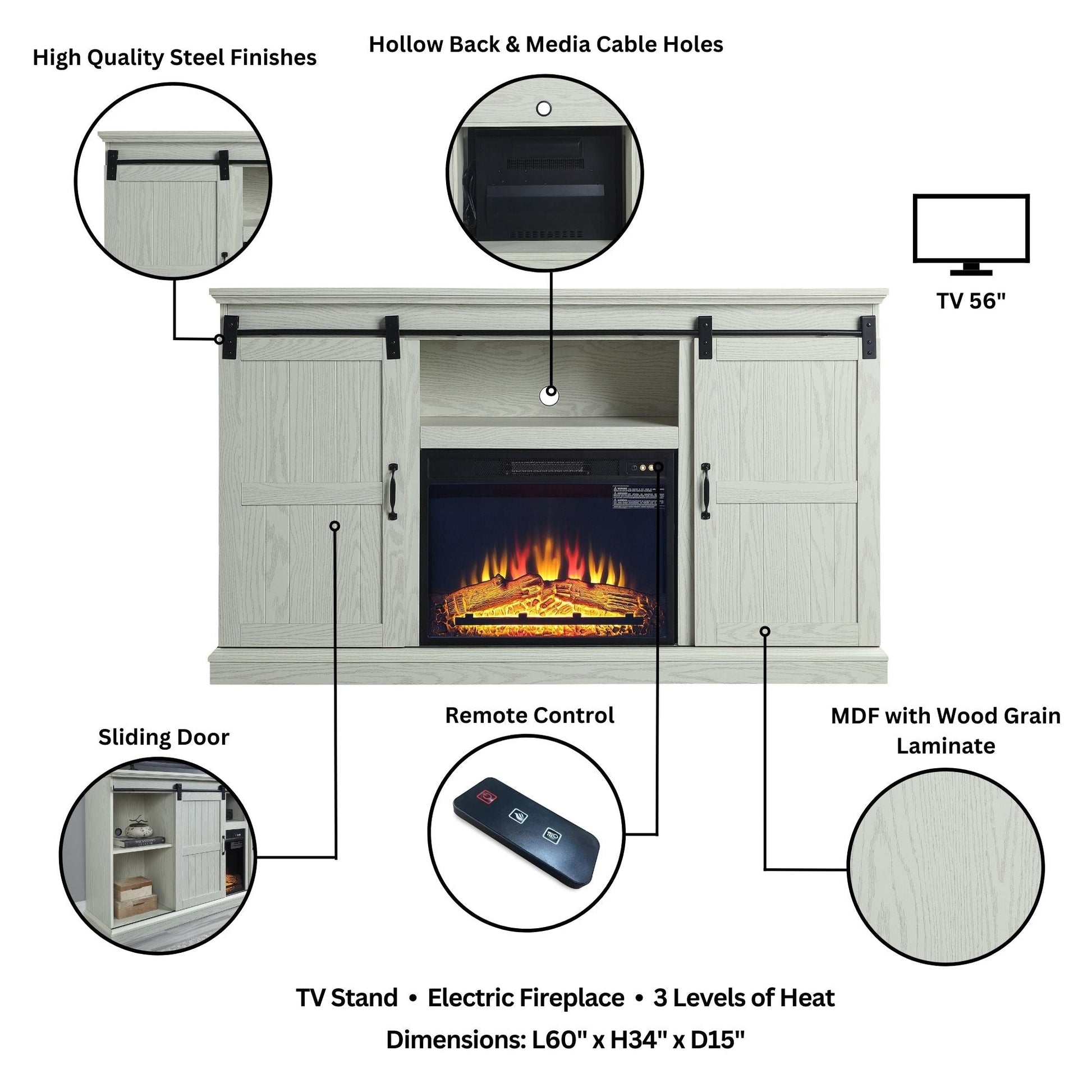 - Includes 1 Electric Firebox, and 5 Shelves with 2 Sliding Doors on an Exposed Metal Glide. Packaging Includes 1 Additional Shelf for Option to Replace Firebox.