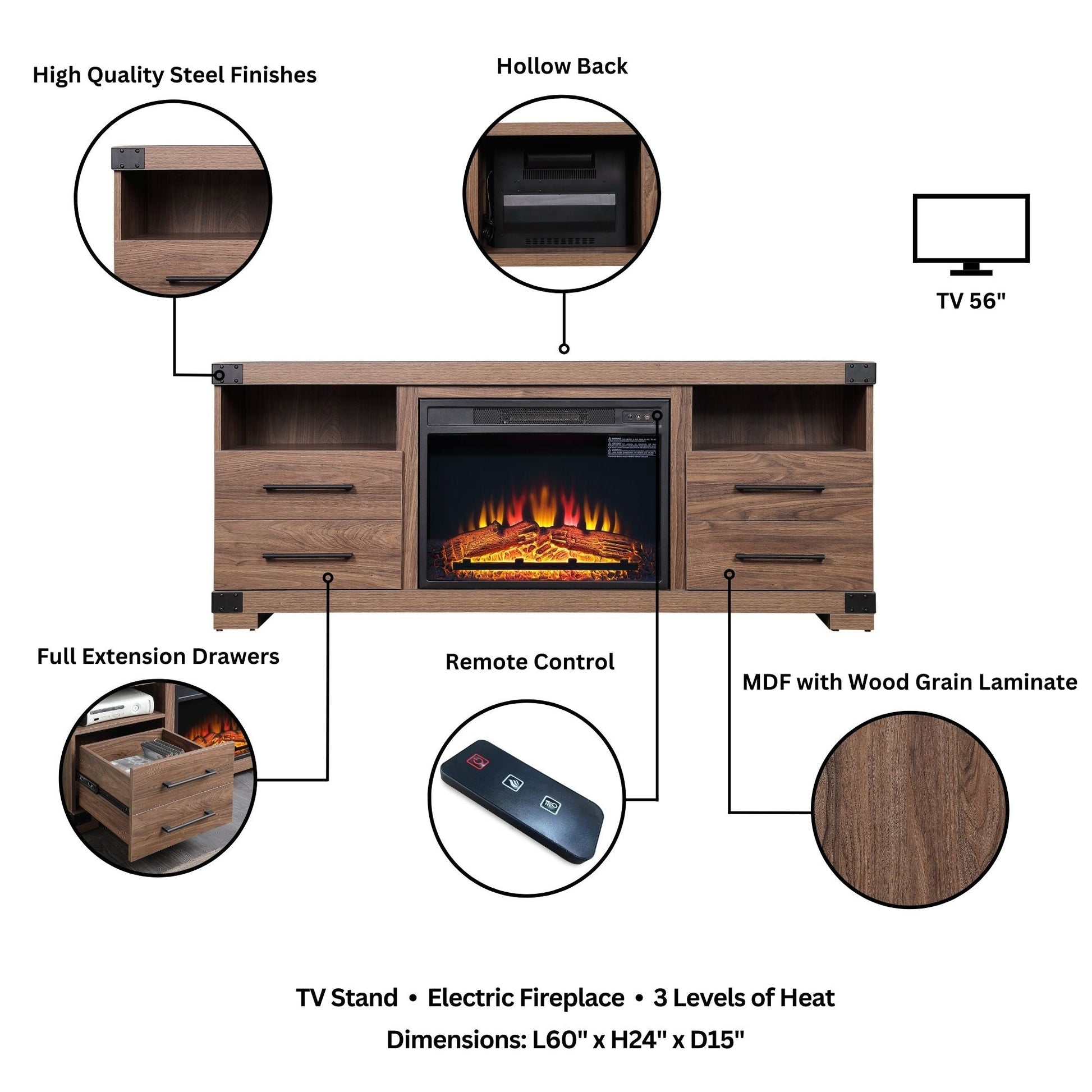 - Upon assembly, Electric Fireplace Dimensions Measure: 23 in. Length, 17.1 in. Height, 5 in. Depth. TV Stand Dimensions Measure: 60 in. Length, 24 in. Height, 15 in. Depth.