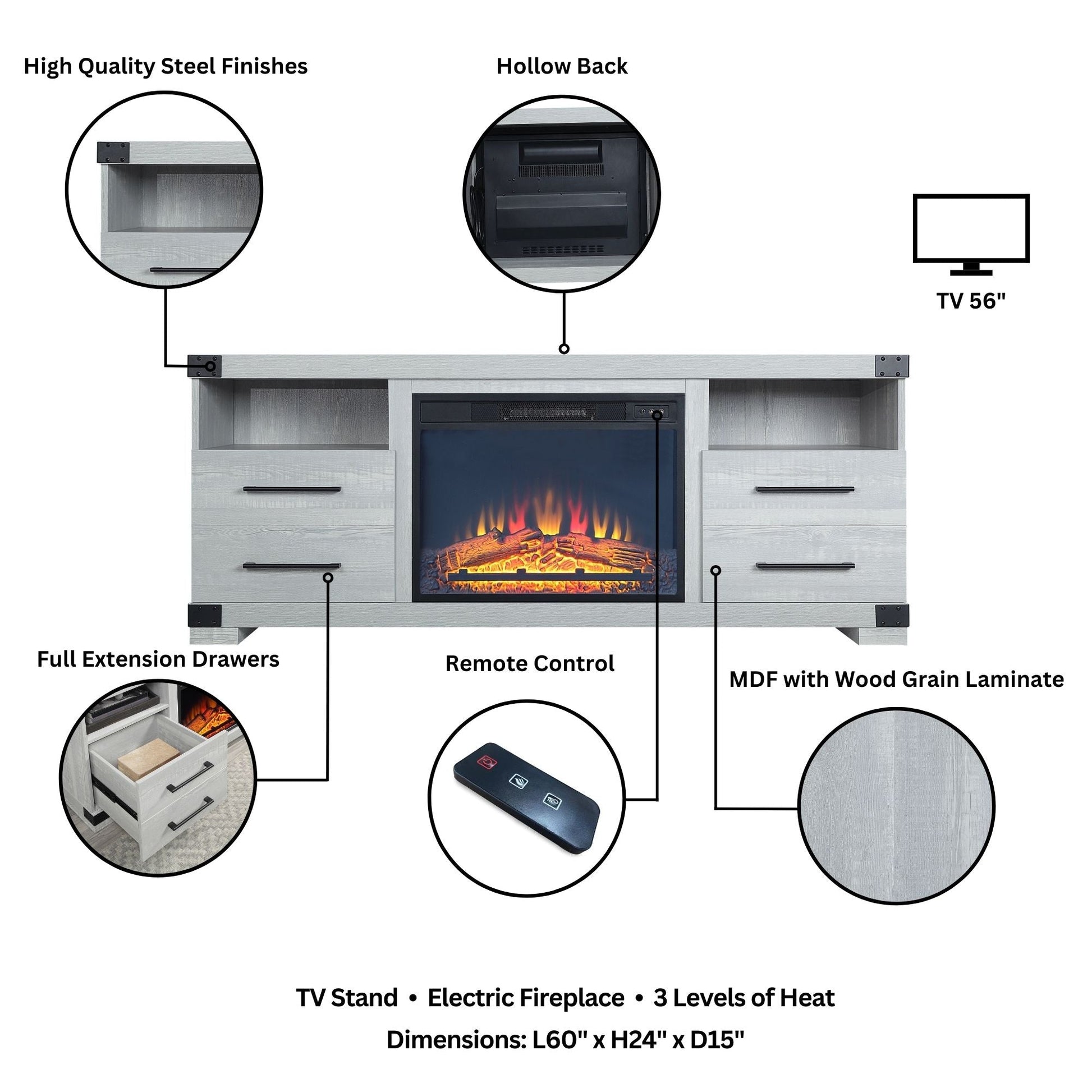 - Includes: 2 Full Extension Drawers, 2 Open Shelves, and 1 Electric Firebox. Packaging Includes 1 Additional Shelf for Option to Replace Firebox.