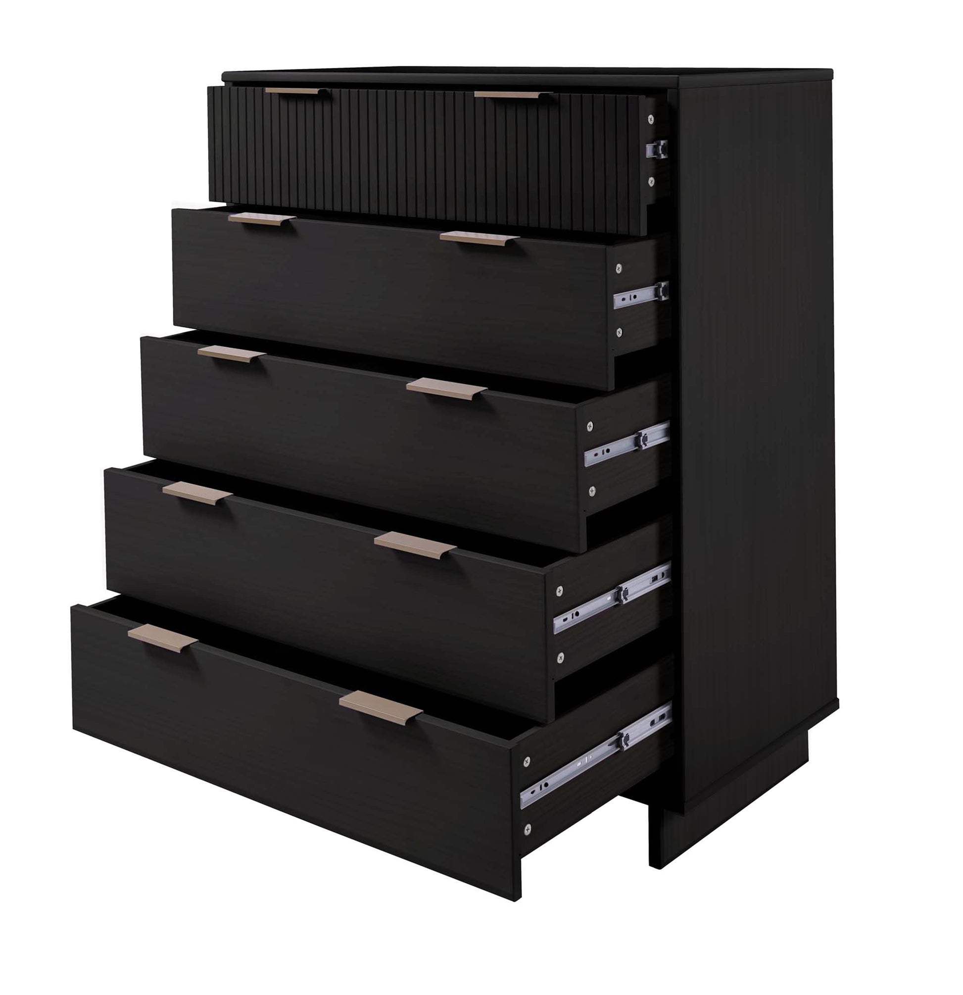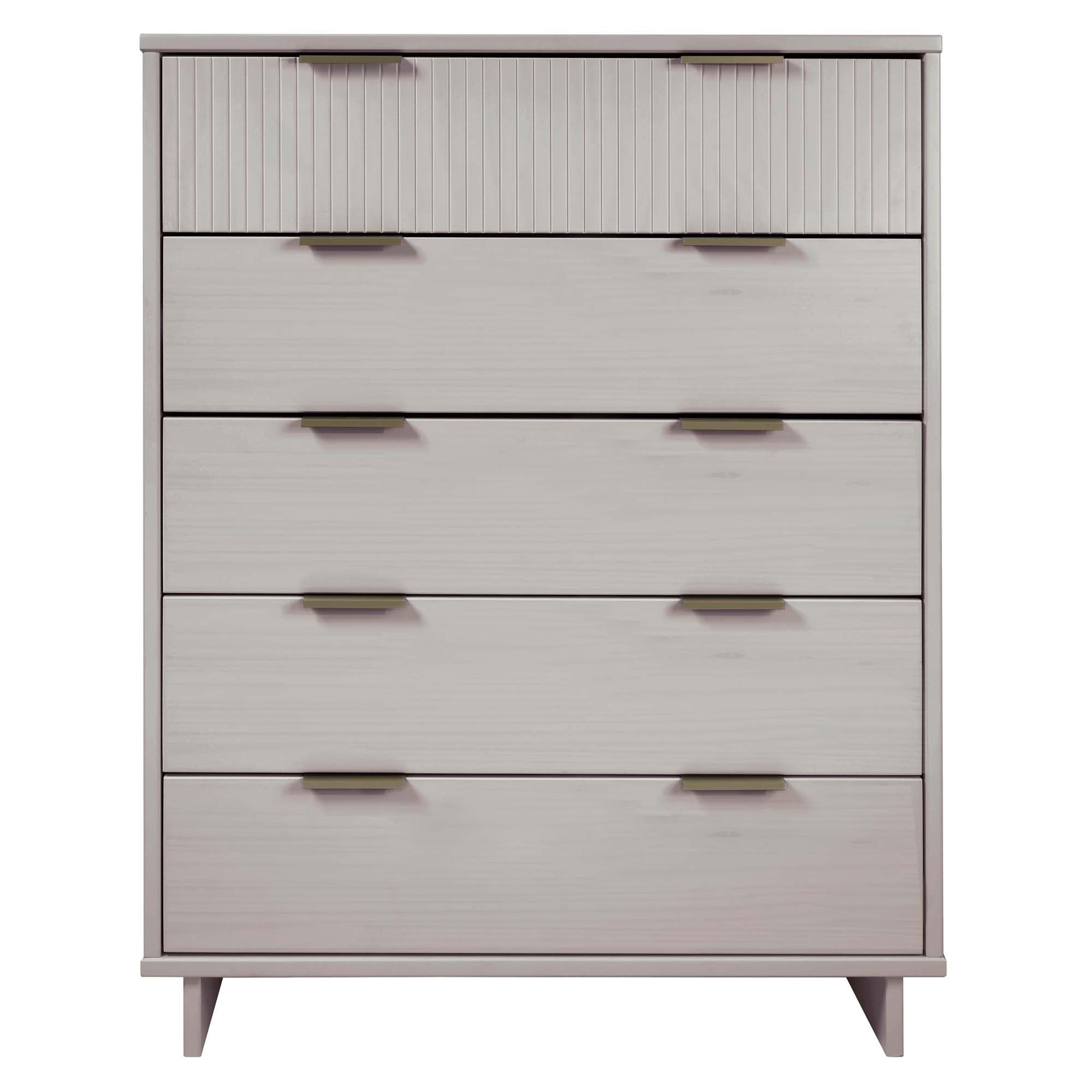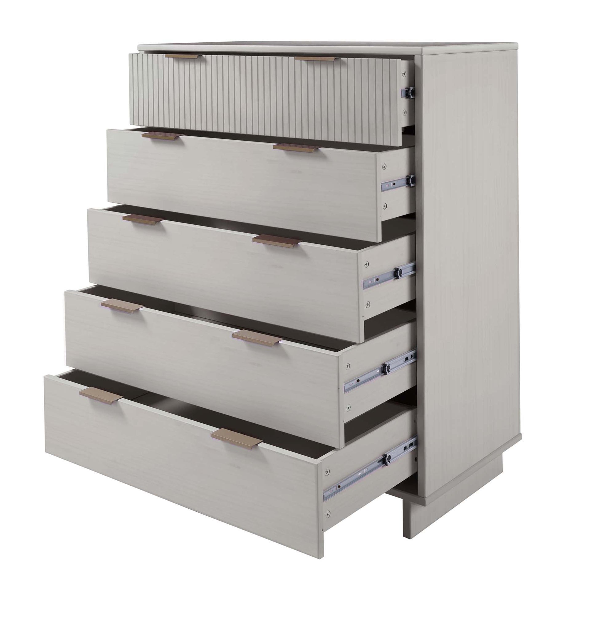 - Includes 5 Full Extension Drawers with Top Drawer Designed in Vertical Textured Ribbed Lines Made from Solid Wood.