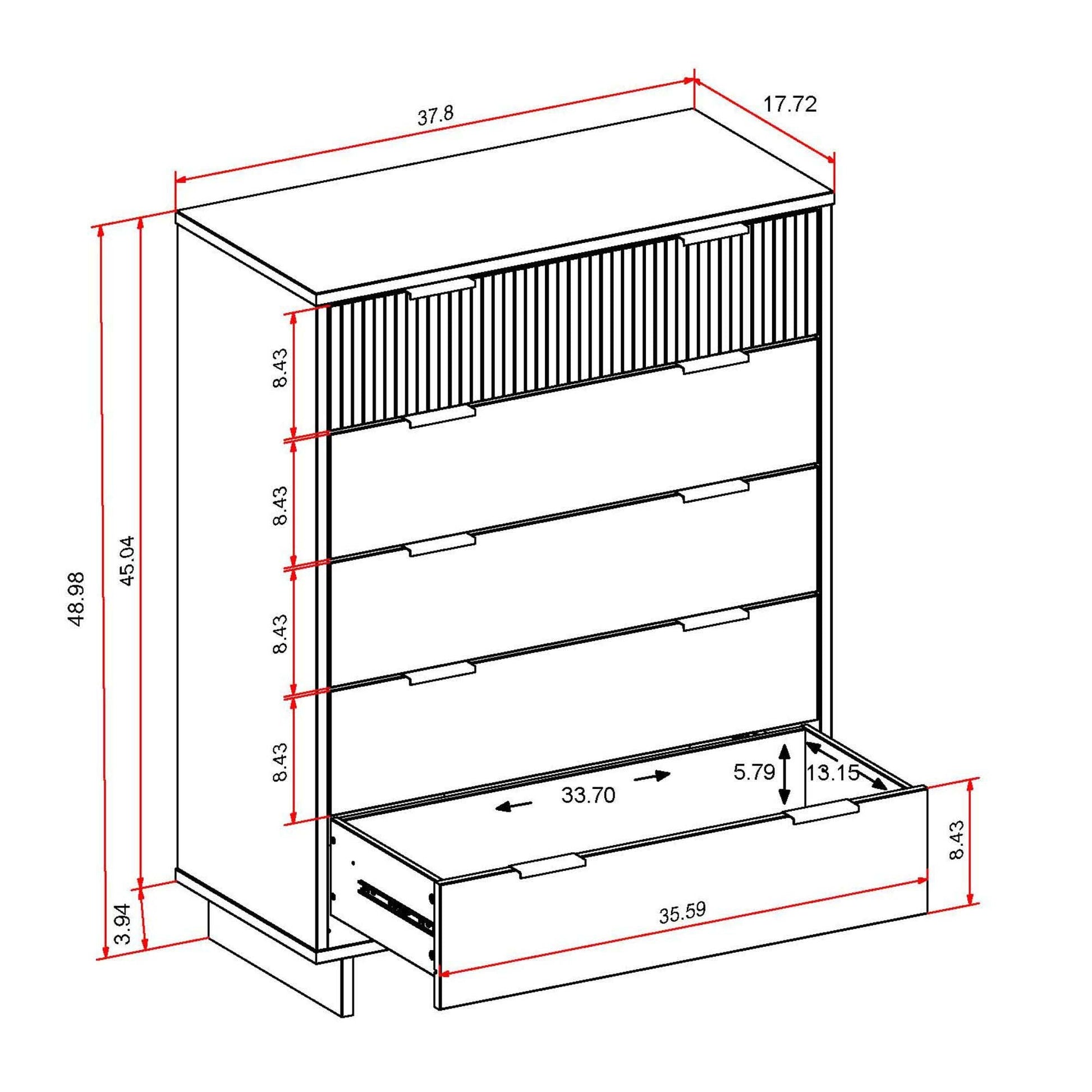 - Upon assembly, Tall Dresser Dimensions Measure: 37.8 in. Length, 48.98 in. Height, 17.72 in. Depth.
