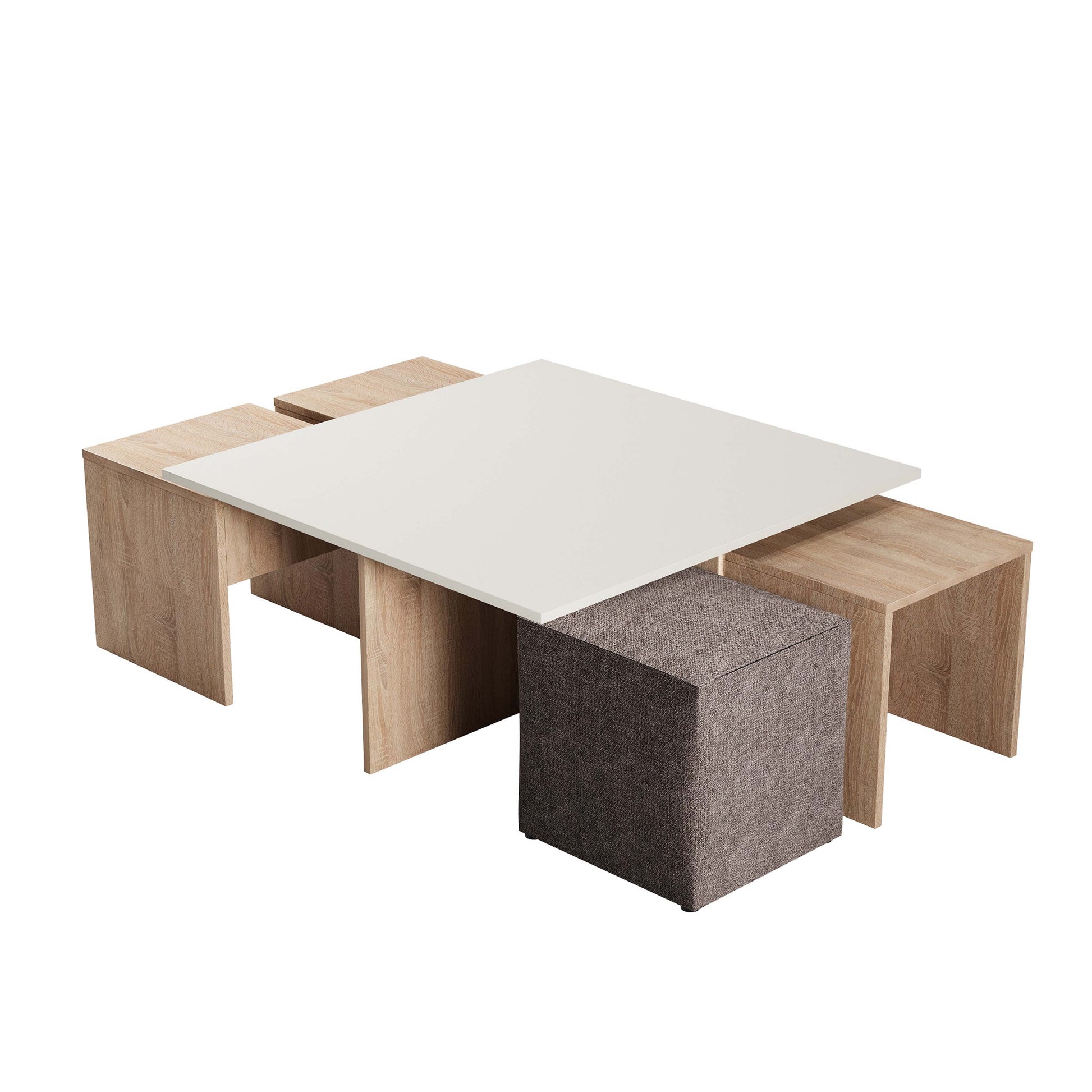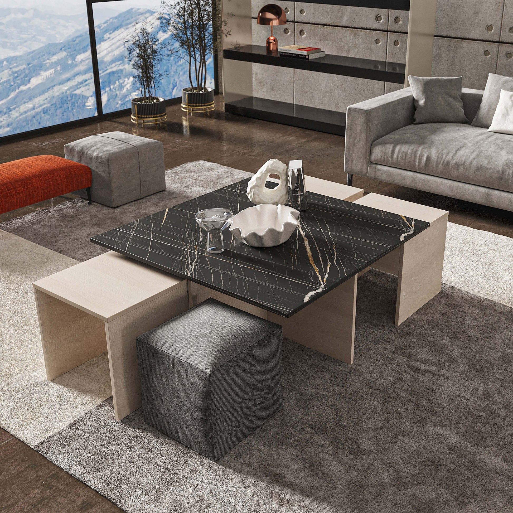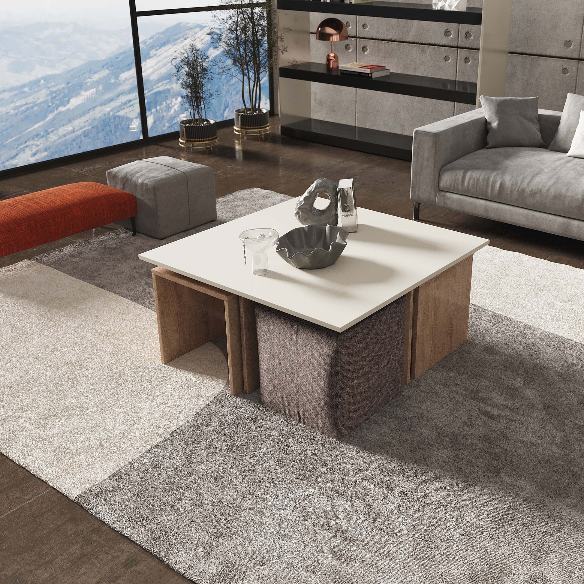 - Modern Coffee Table with Nested Ottomans for Living Room Use.