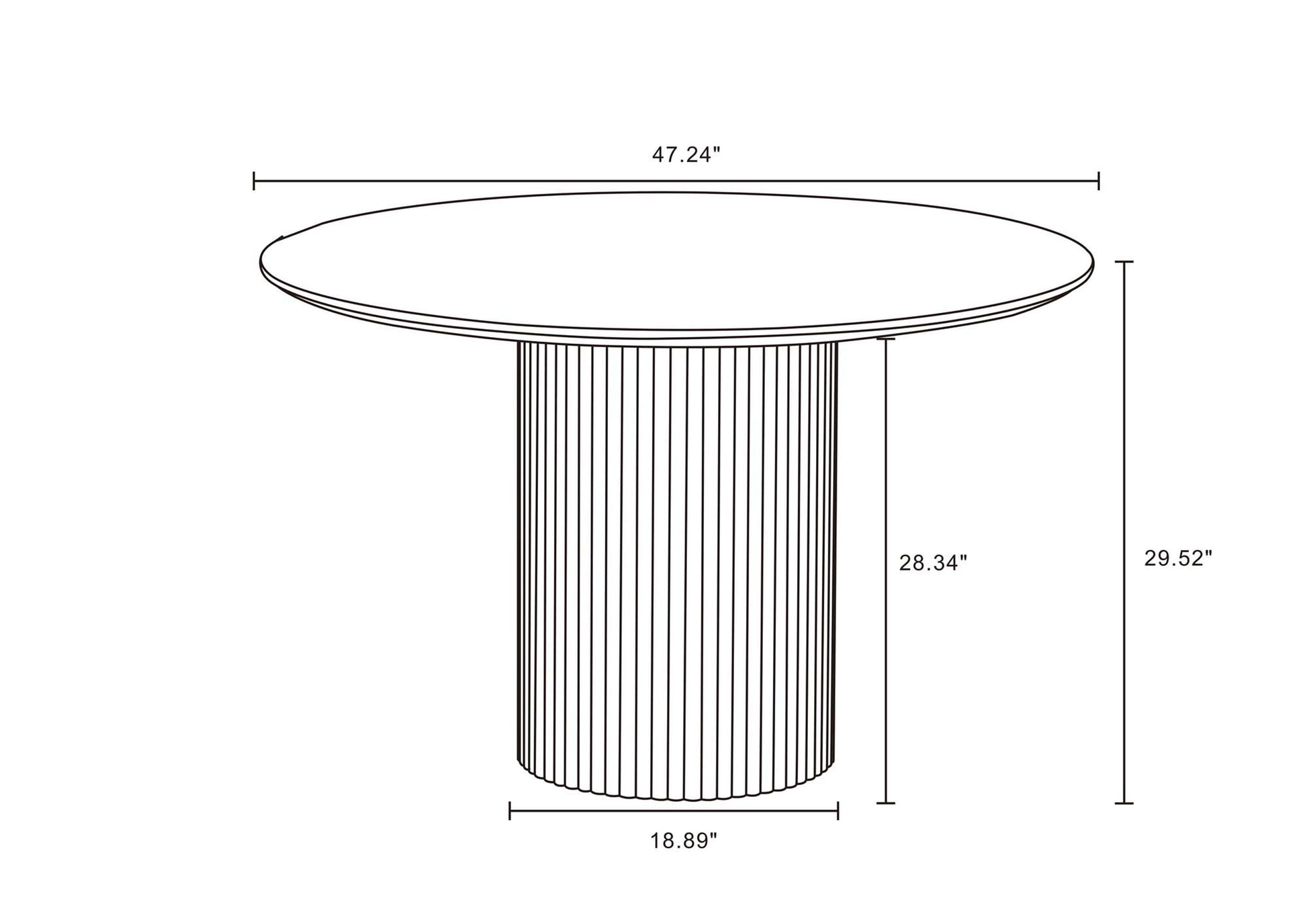- Upon assembly, Dining Table Dimensions Measure: 47.24 in. Length, 29.52 in. Height, 47.24 in. Depth.