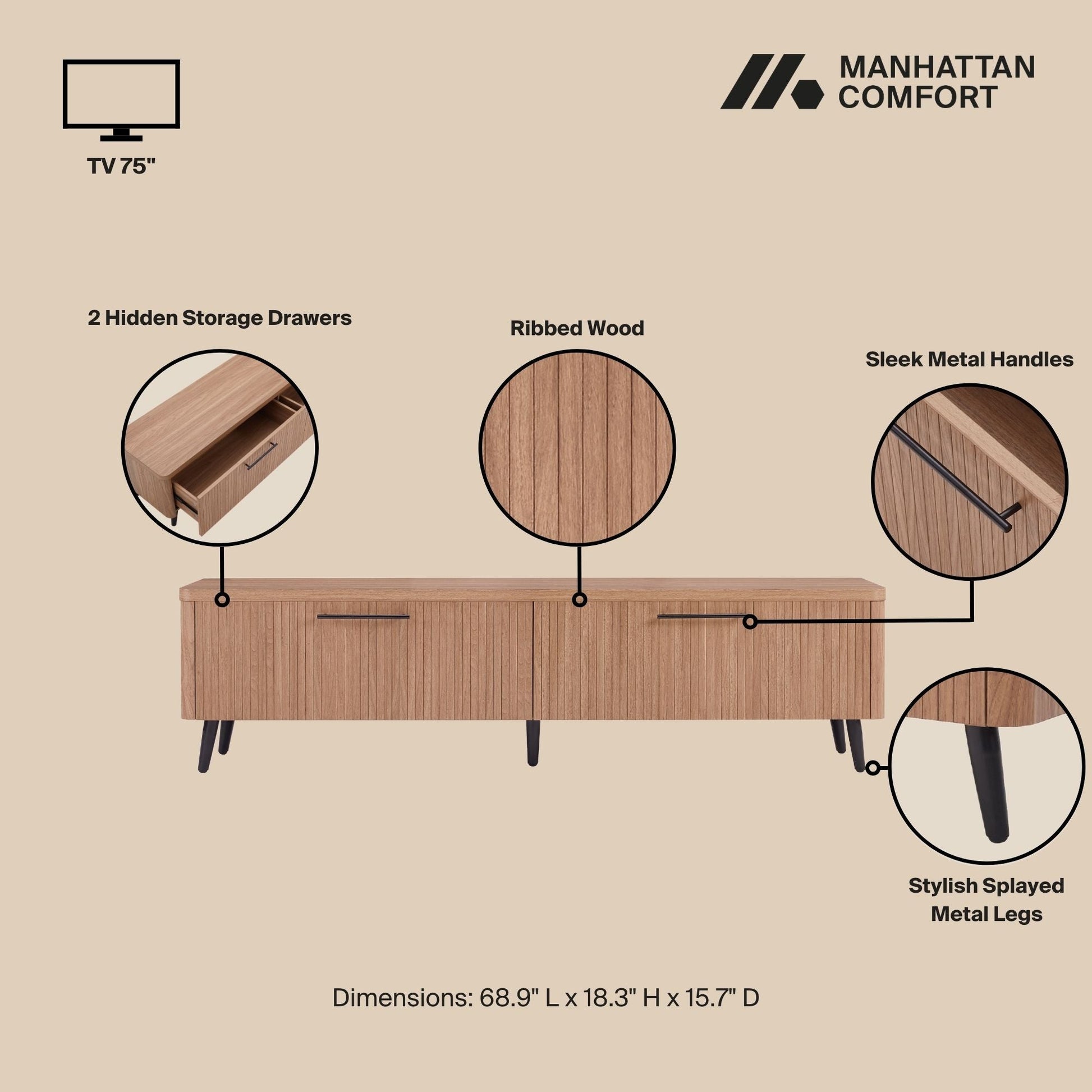 - Upon assembly, TV Stand Dimensions Measure: 68.9 in. Length, 18.3 in. Height, 15.7 in. Depth.