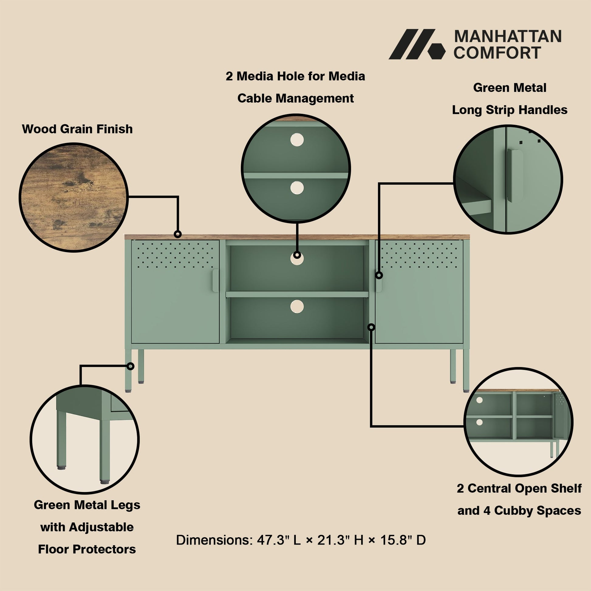 - Upon assembly, TV Stand Dimensions Measure: 47.3 in. Length, 21.3 in. Height, 15.8 in. Depth.