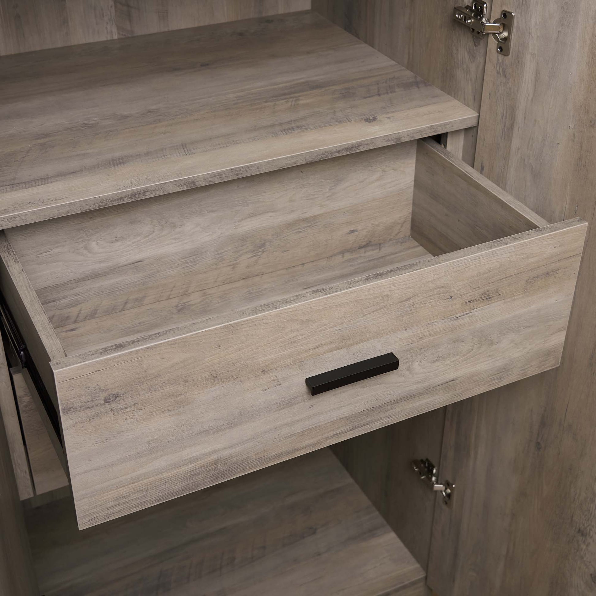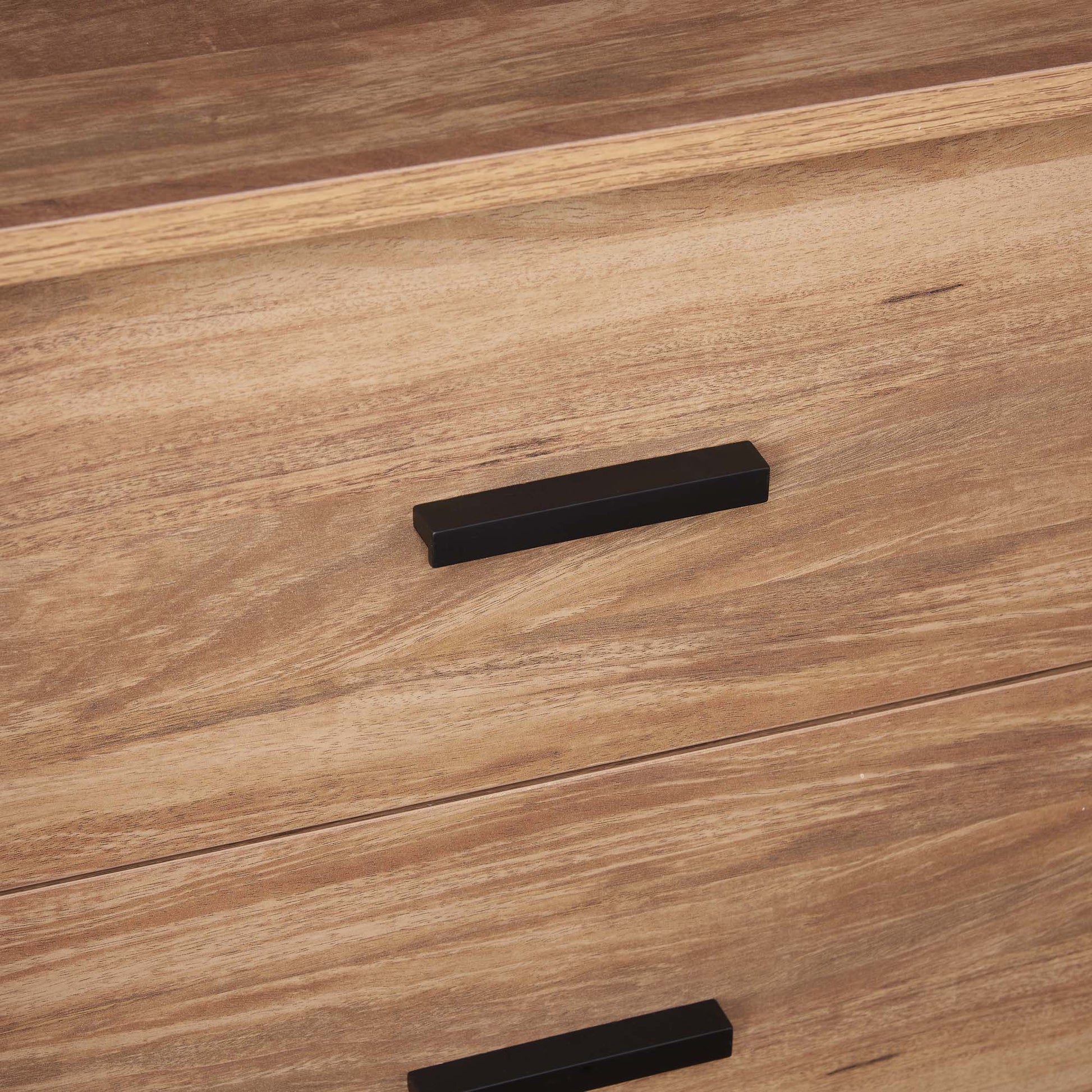 - Sleek Black Metal Horizontal Drawer Handles with Full Extension Capabilities.