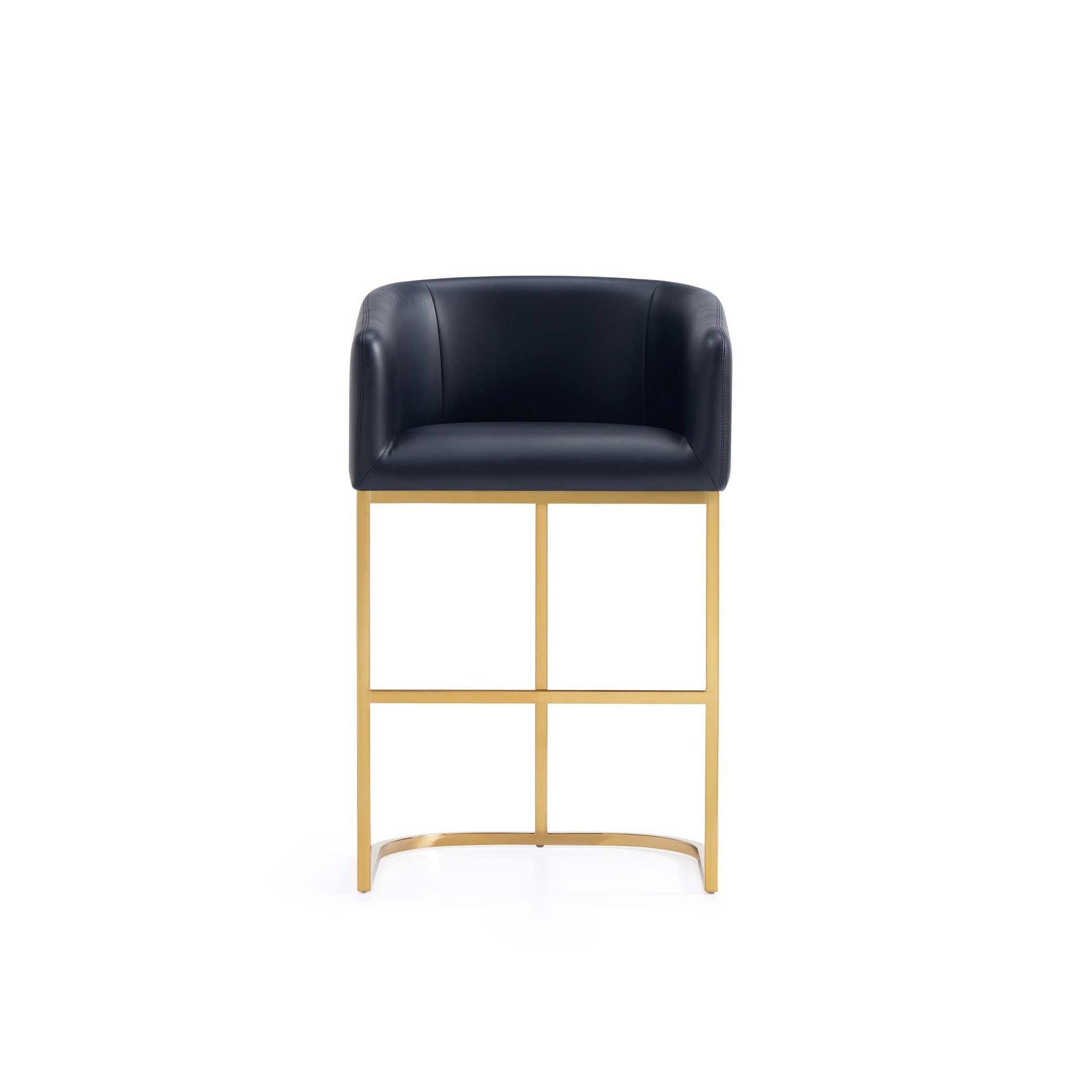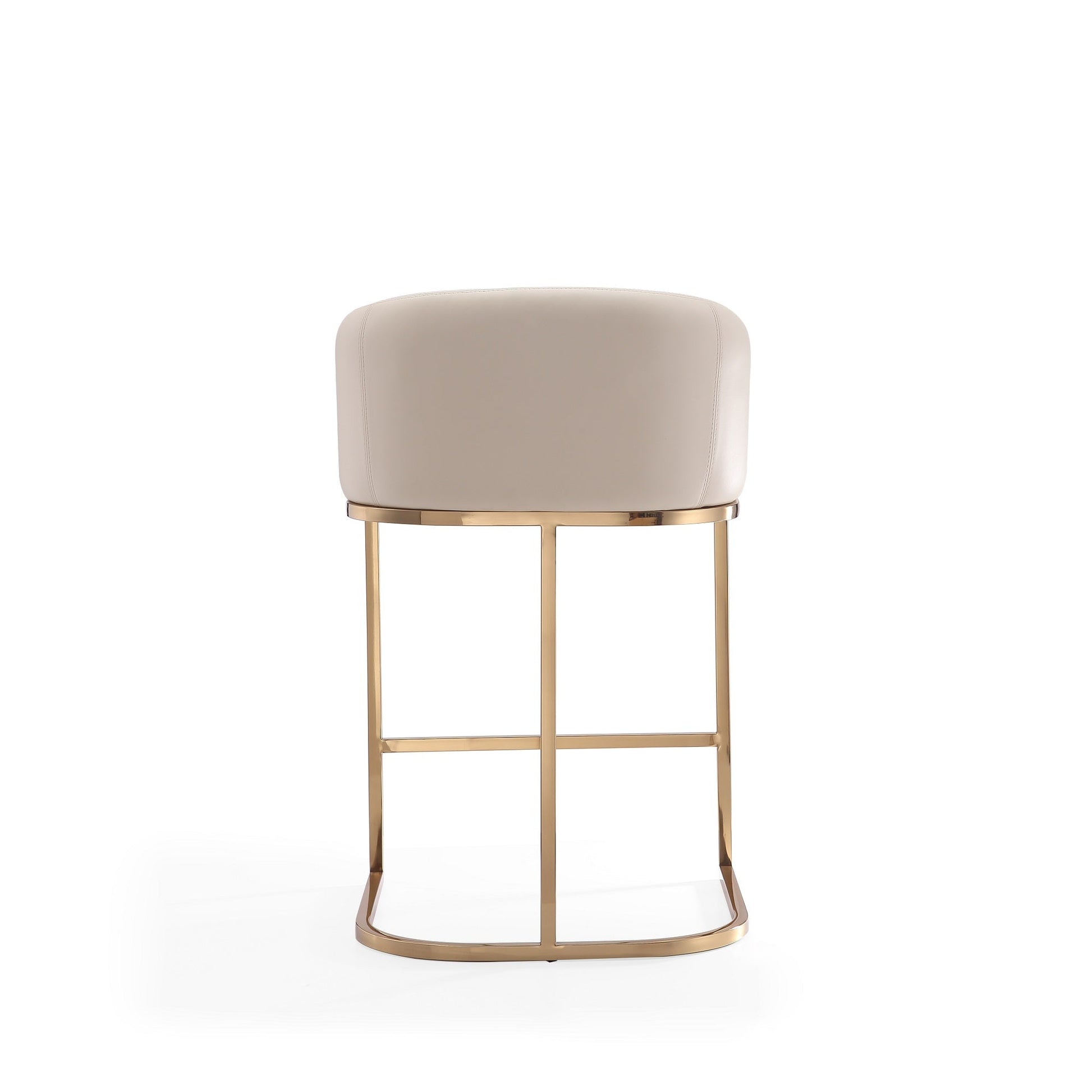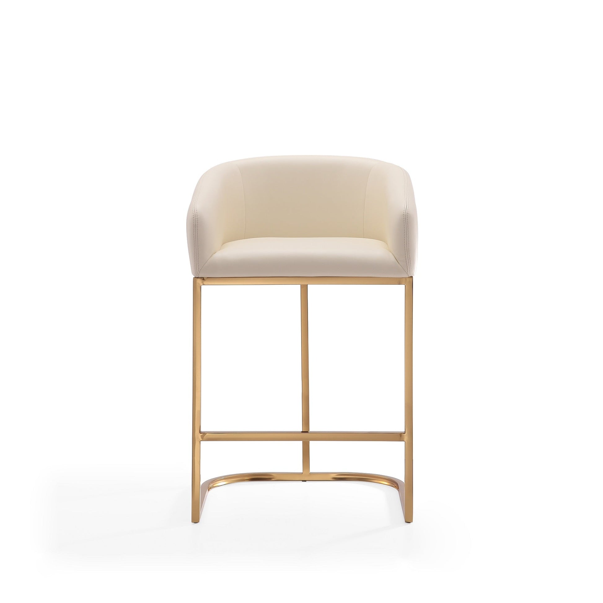 A hint of mid-century modern style that brings the chic and elegant flair to any home's decor. This stool is all kinds of wonderful. A clean-lined, curved, and comfortable seat, sits atop a shimmery gold semi-circle pedestal base. A metal footrest finishes the look, bringing added comfort to the leather-upholstered piece. Gorgeously well-served, in a perfect neutral tone for that touch of warm texture.