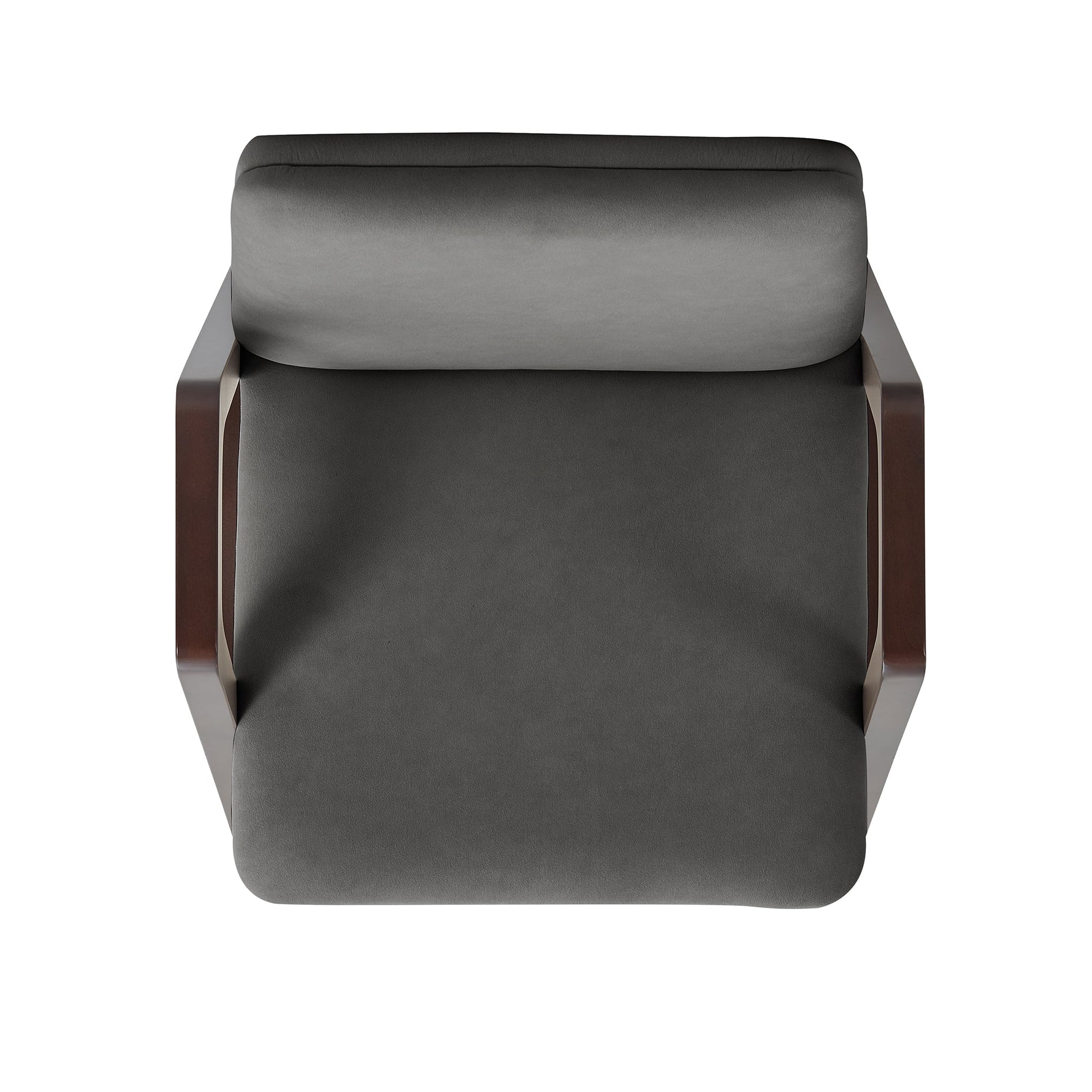 Where modern form meets timeless comfort, this dining chair brings architectural elegance to your space. Its angled beech wood frame, finished in a deep walnut stain, features striking open arms that echo mid-century design. Upholstered in velvet, the seat and backrest provide an invitingly plush yet supportive feel. Whether styled around a dining table or as a standalone accent, it’s a refined blend of sculptural detail and everyday comfort.