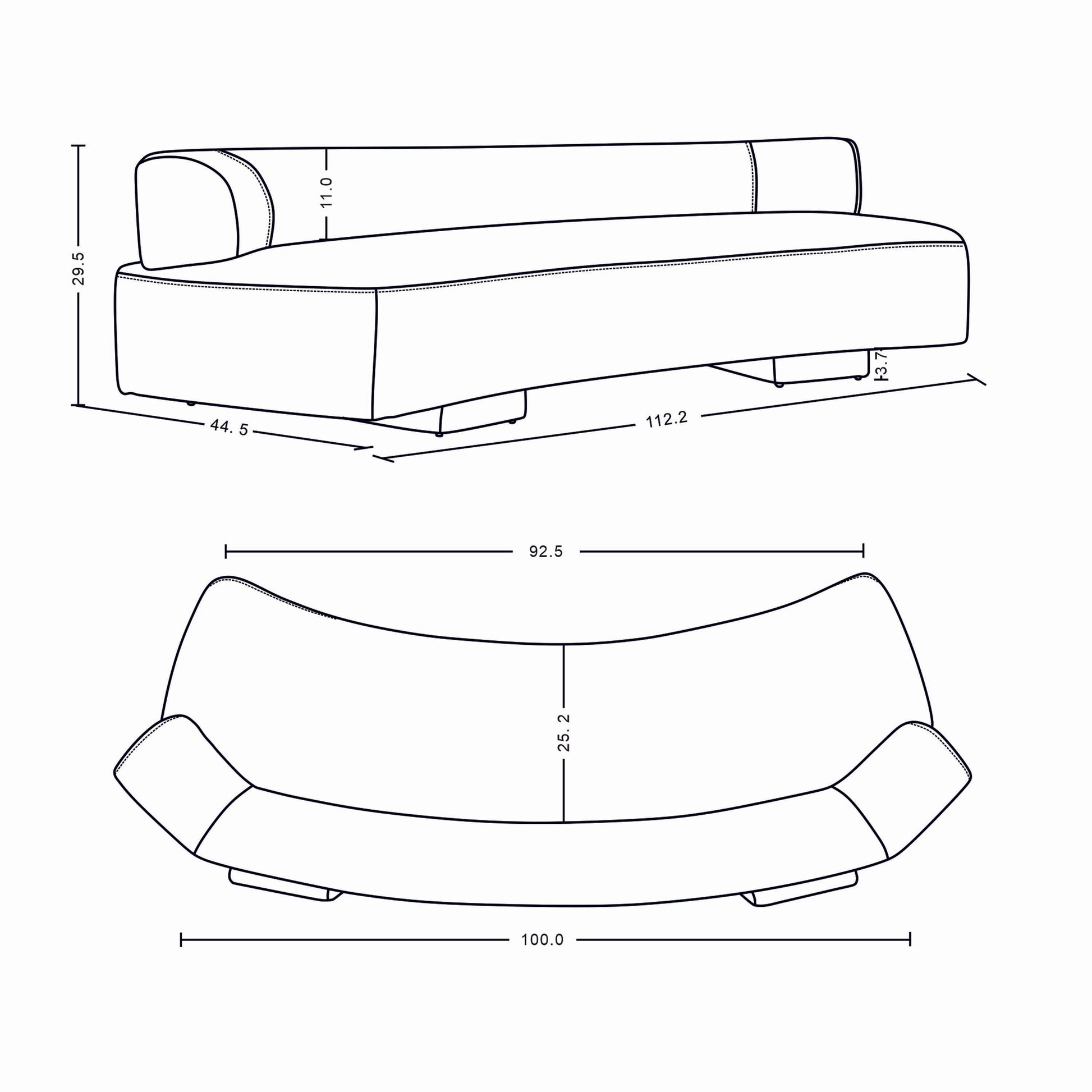 Dimensions: 112.2 in. Length, 29.5 in. Height, 44.5 in. Depth