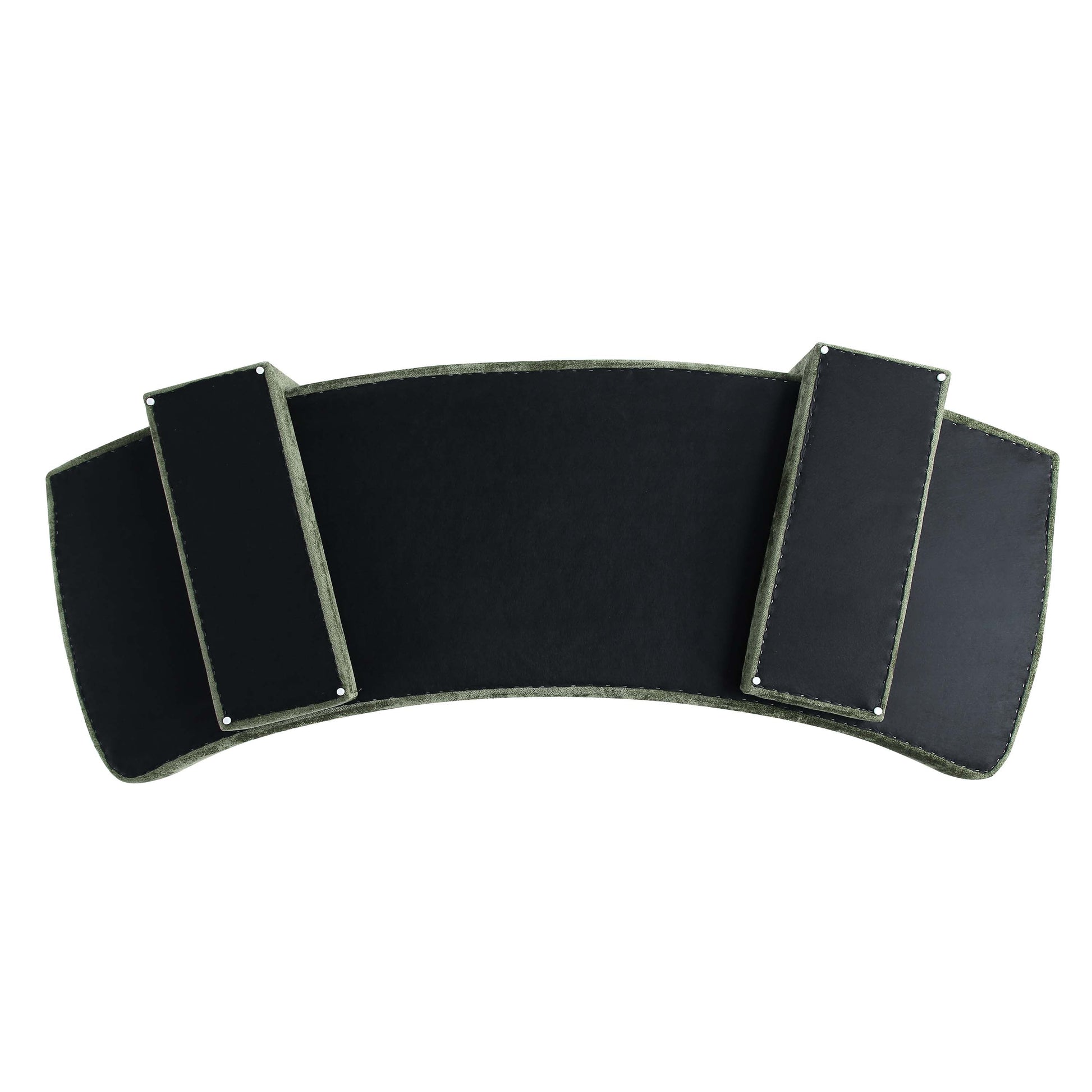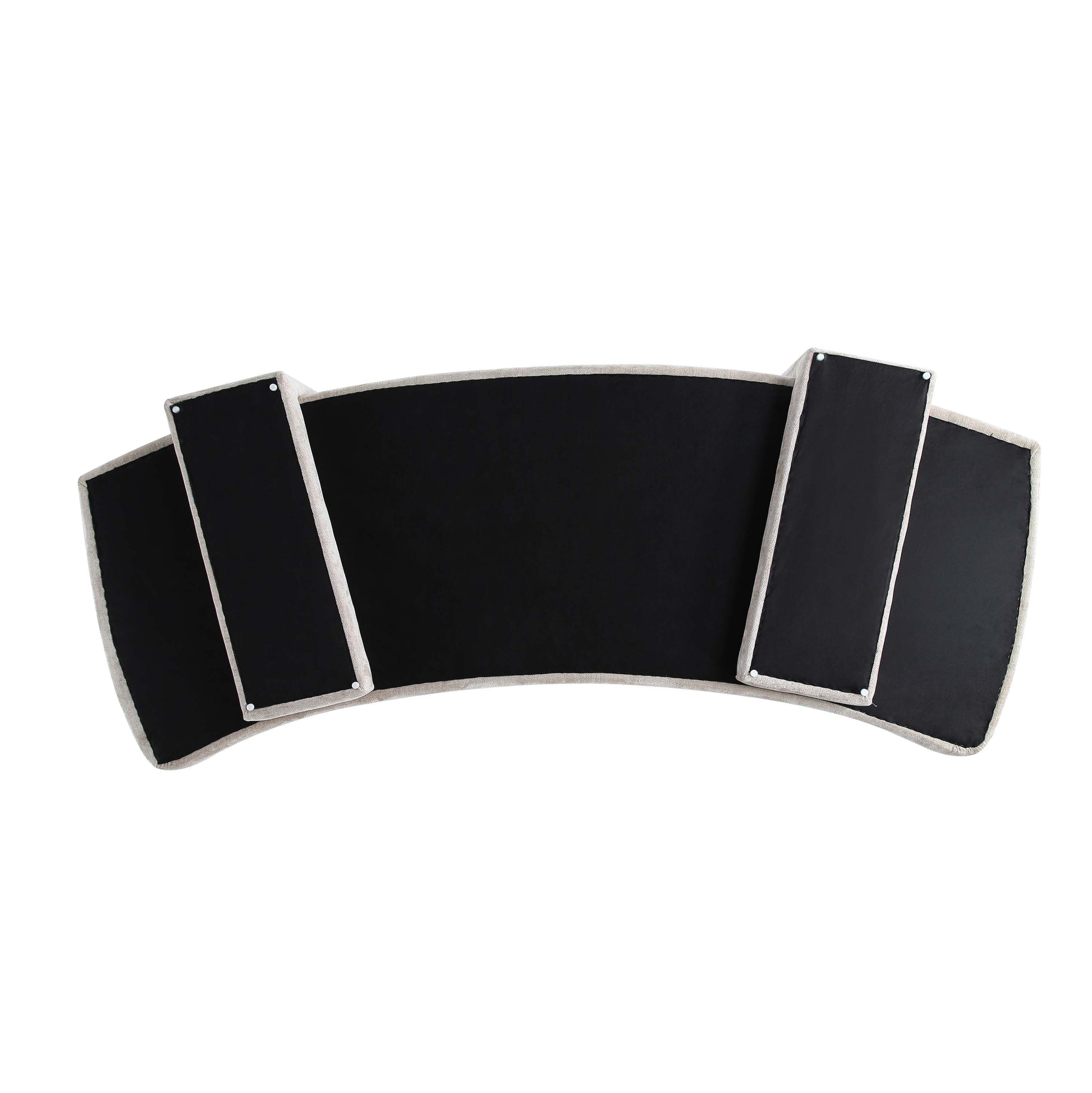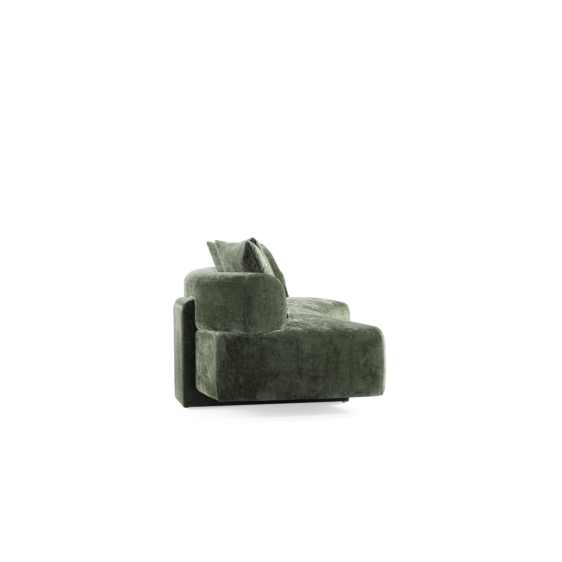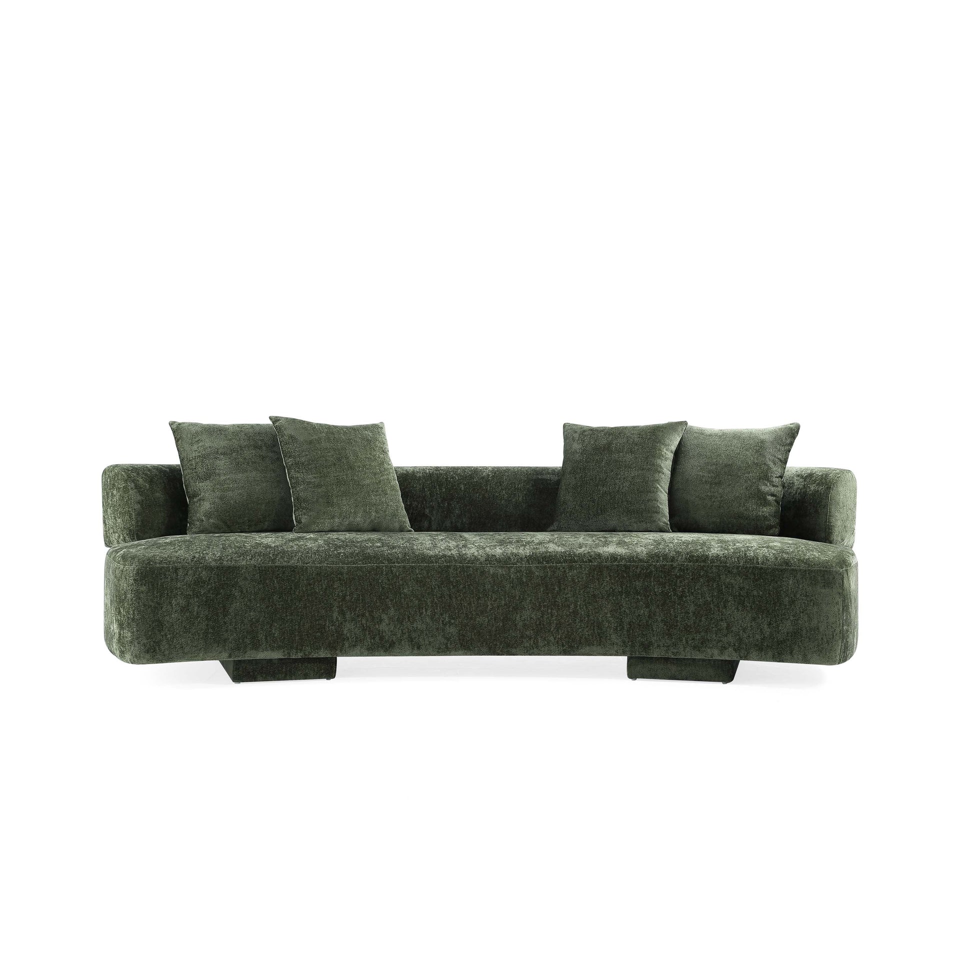 - Curved Back Design with Unique Upholstered Wrap Around Legs. Includes 4 Accent Pillows.