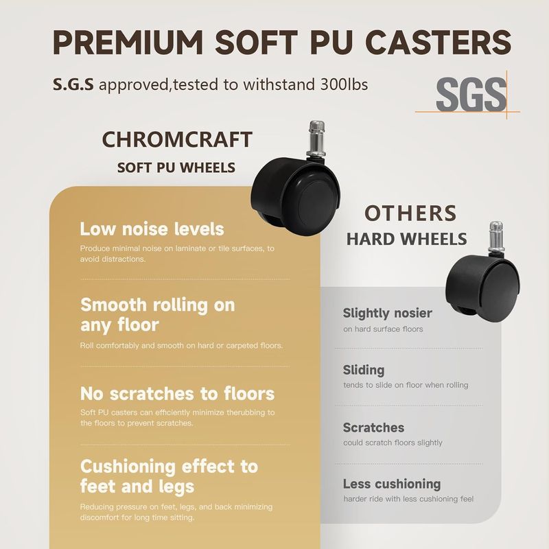 Innovative use of softer polyurethane double-wheel casters allows for super smooth movement across any floor surface. Unlike the hard surface casters commonly used on most dining chairs, our softer polyurethane casters effectively minimize floor scratches, giving you a smoother and scratch-free experience. Upgrade to Chromcraft; it's easier to move around in your dinette, kitchen, or game room and gentle to your floors.