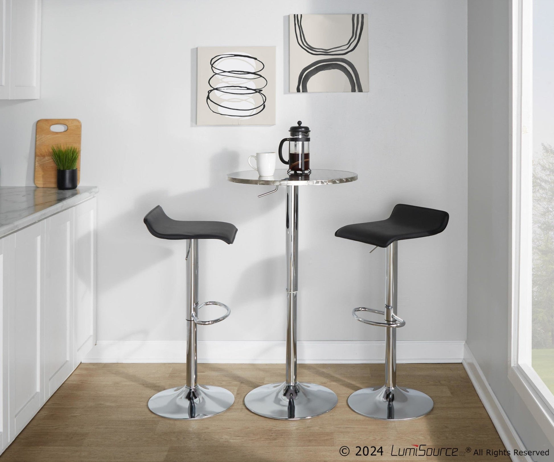 Create a cozy pub or bistro atmosphere in your home with the contemporary design of the Round-Ale Bar Set by Majestic Office Furniture. This sleek table has a chrome metal base with a brushed aluminum top that offers an eye-catching luster, while the Ale Bar Stools add a unique appeal with their wave-shaped seat. The Table can be adjusted from dining to bar height. Available in a variety of upholstery colors, choose the one that ties in with your decor.