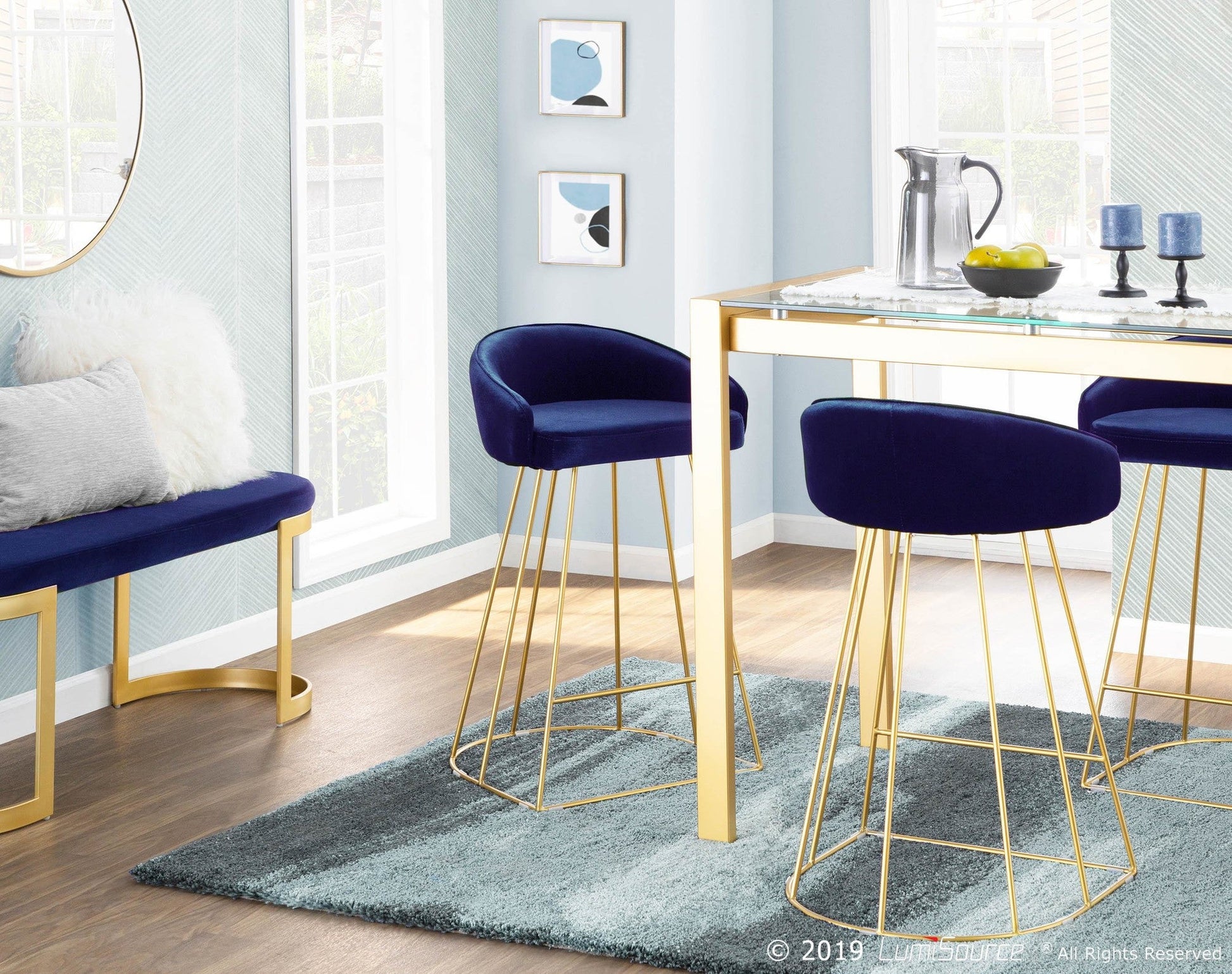 Opulent and confidently contemporary - that's the Counter Stool by Majestic Office Furniture. Features a captivating cage-like gold tone metal base with footrest, subtle curved backrest, and an elegant upholstered seat available in various modern colors. Definitely a bold touch of fancy for your seating needs.