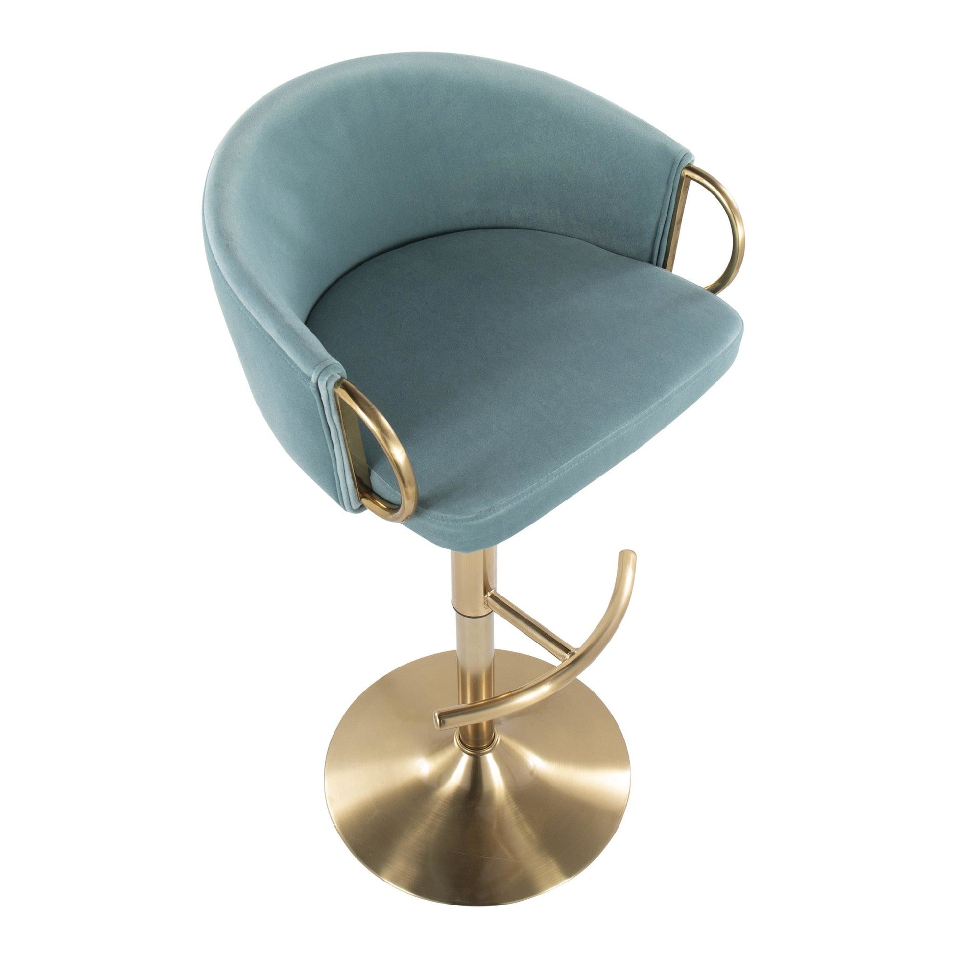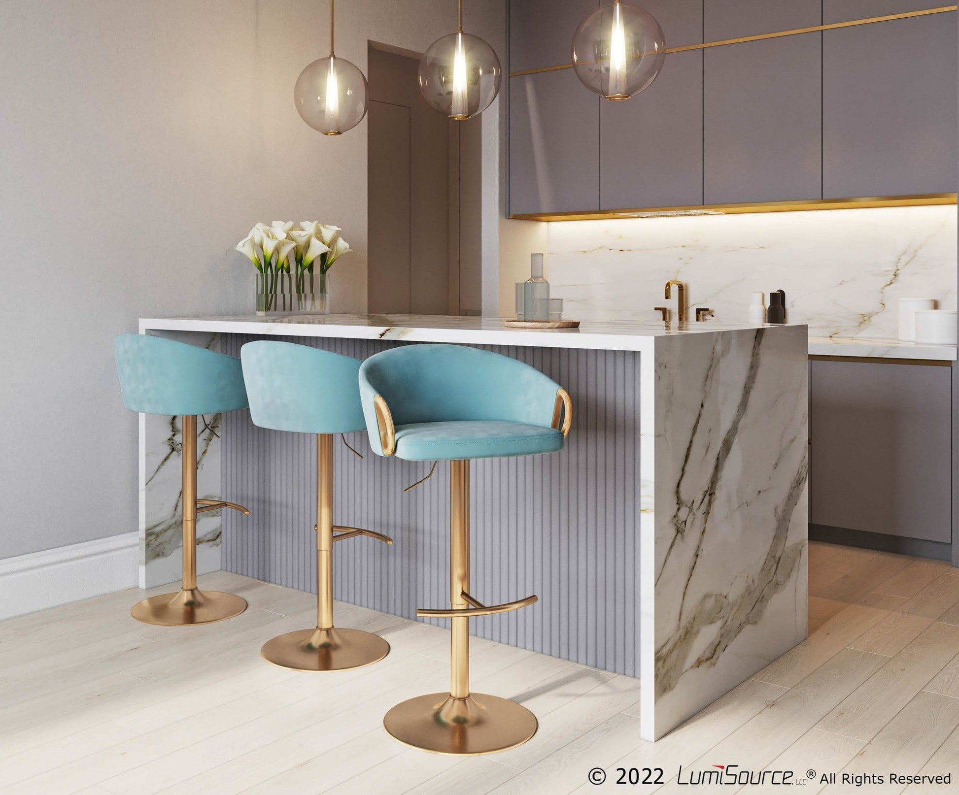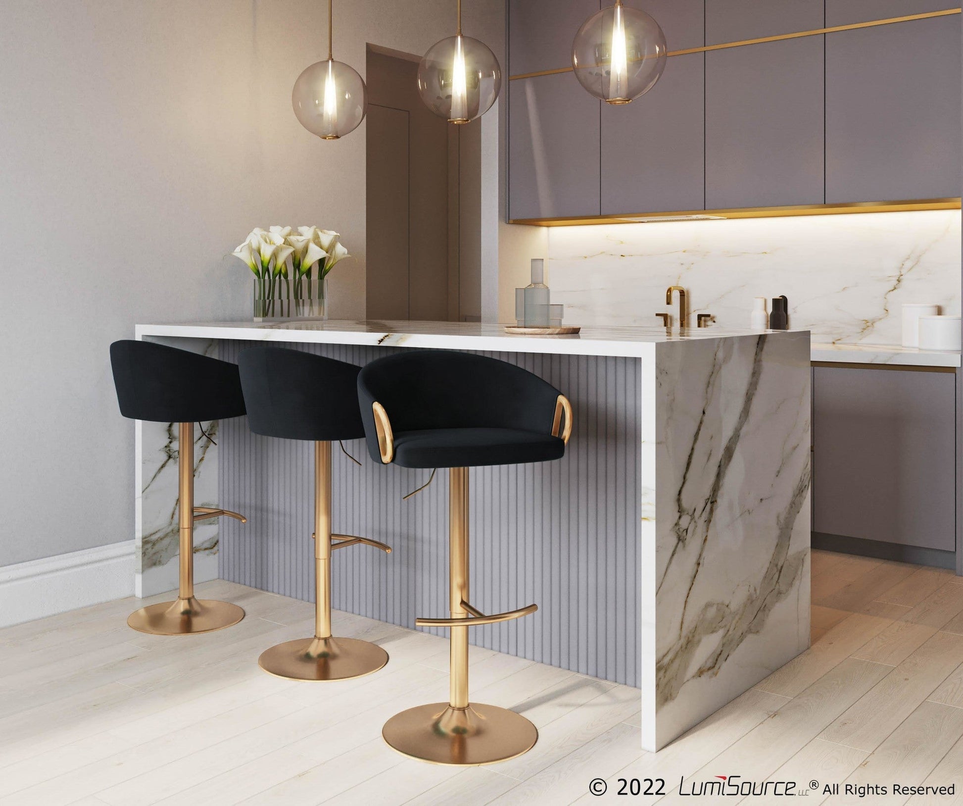 Chic modern style shines bright with the unique design of the Adjustable Bar Stool by Majestic Office Furniture. With a low rounded backrest, sleek gold armrests, and a gold metal base, it's the perfect piece for your contemporary dining or bar area. The Adjustable Bar Stool has smooth swivel capability with lush velvet upholstery. Available in various bold colors.