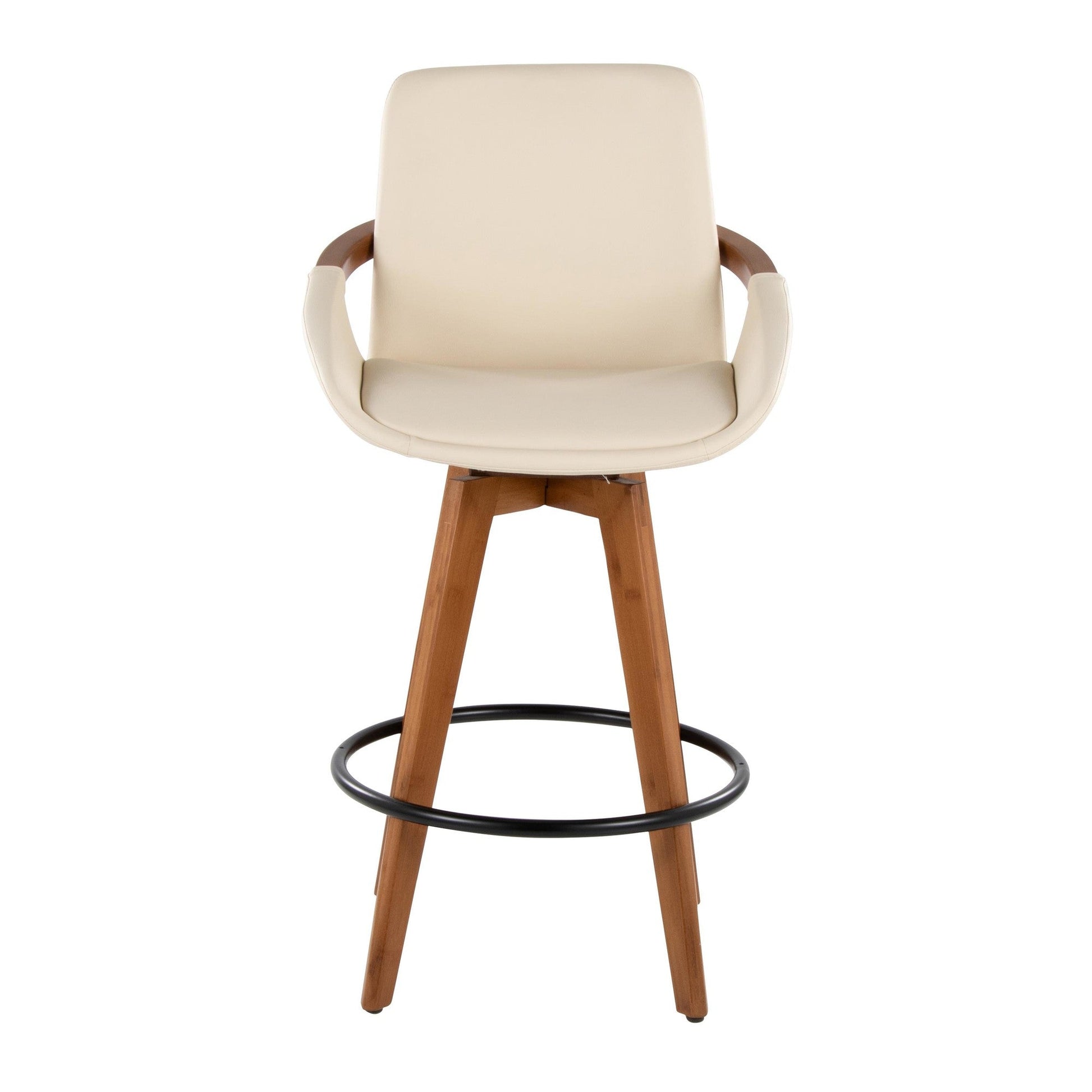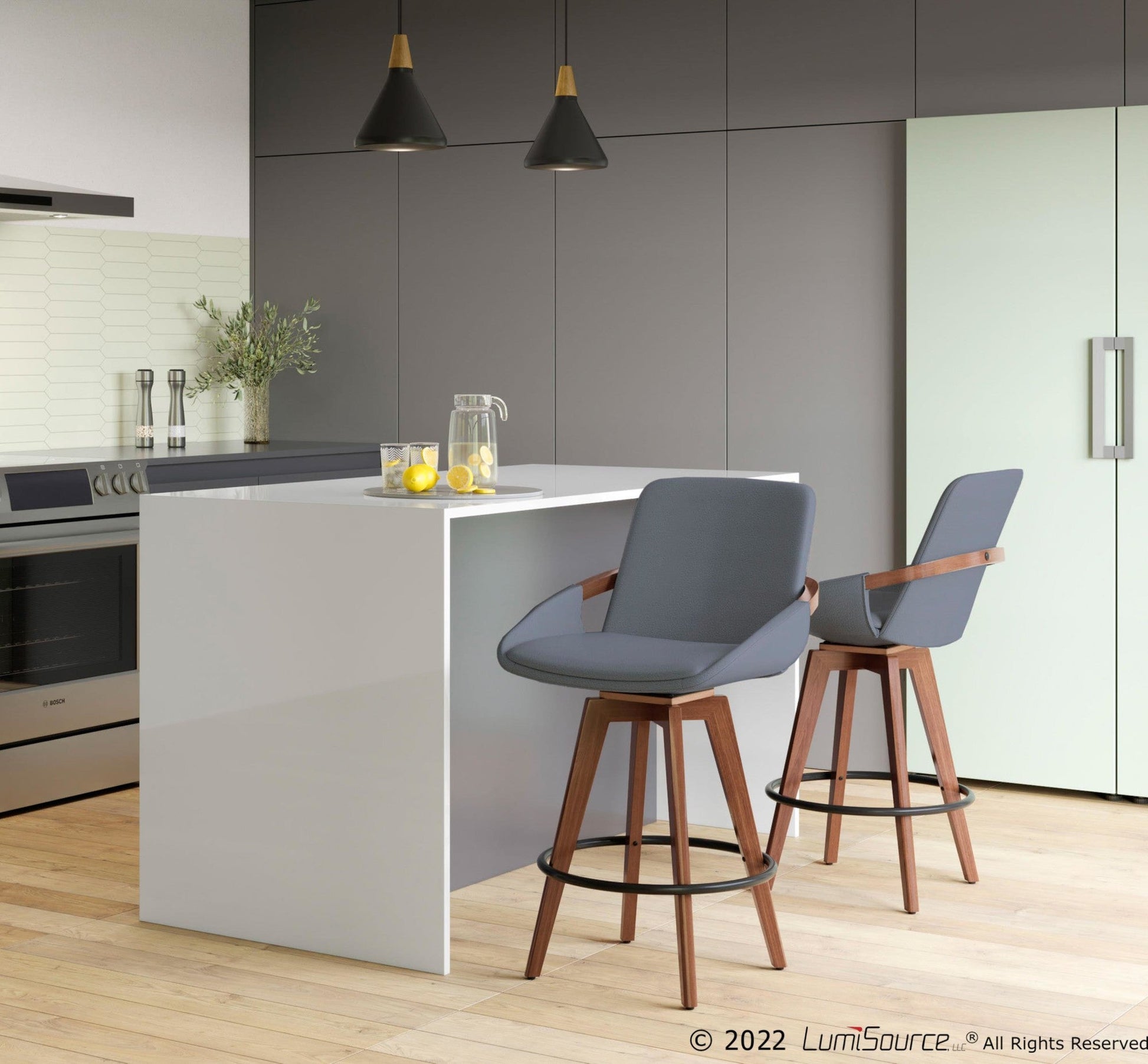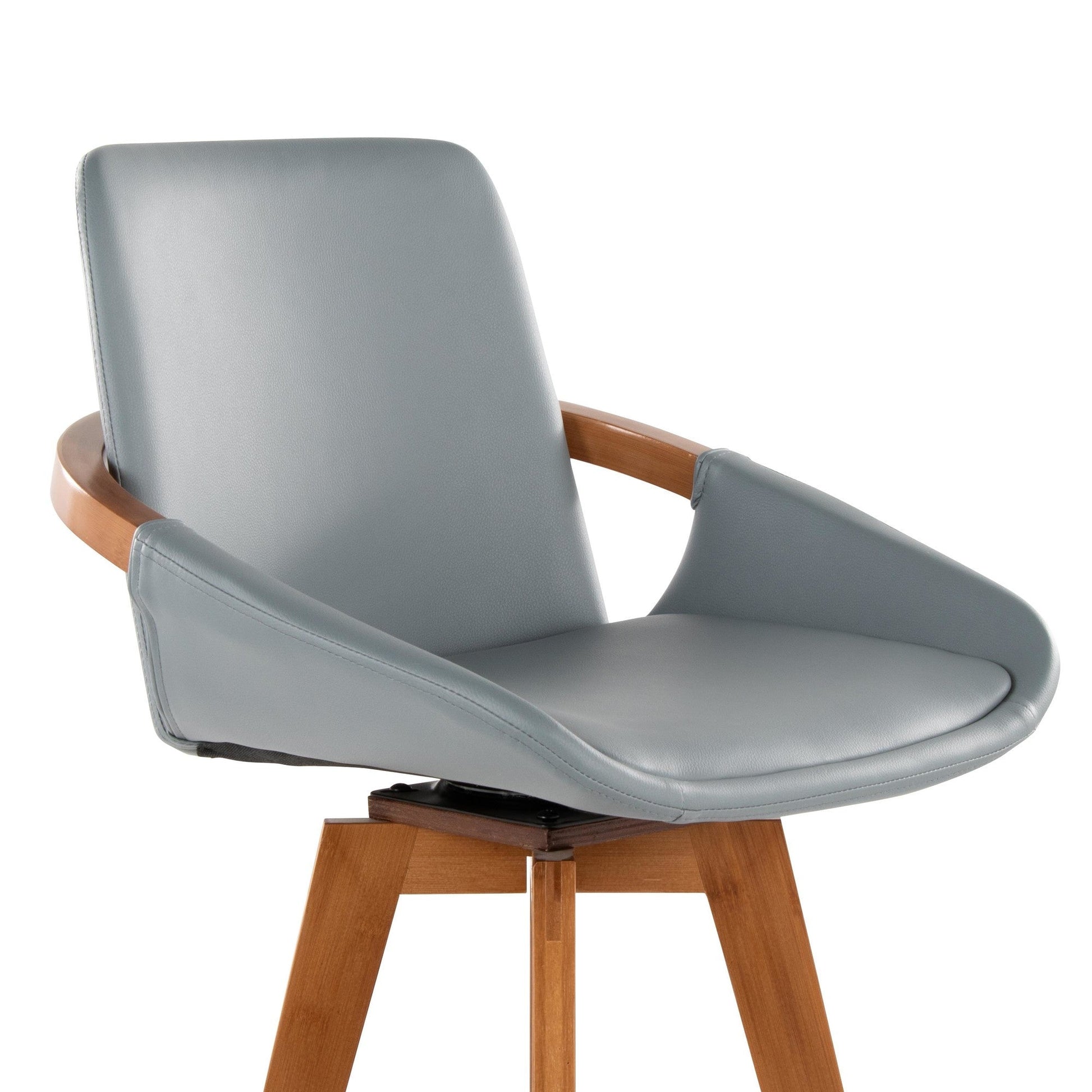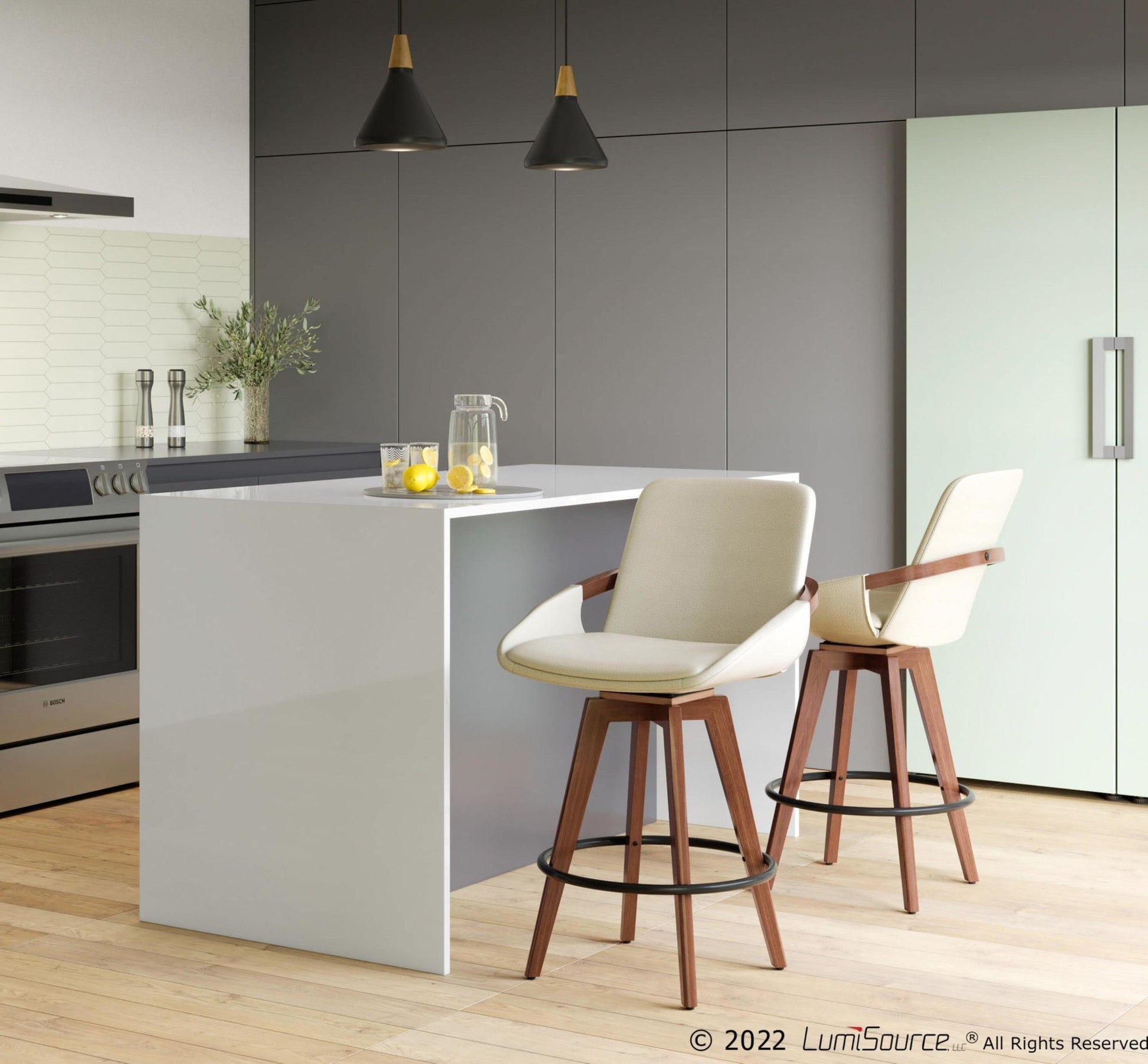 Mid-Century inspired, the Counter Stool by Majestic Office Furniture combines style and comfort! A faux leather seat is accented by stylish walnut wood armrest and legs, with smooth swivel capability. Available in a variety of color combinations, choose the one that fits your space the best.