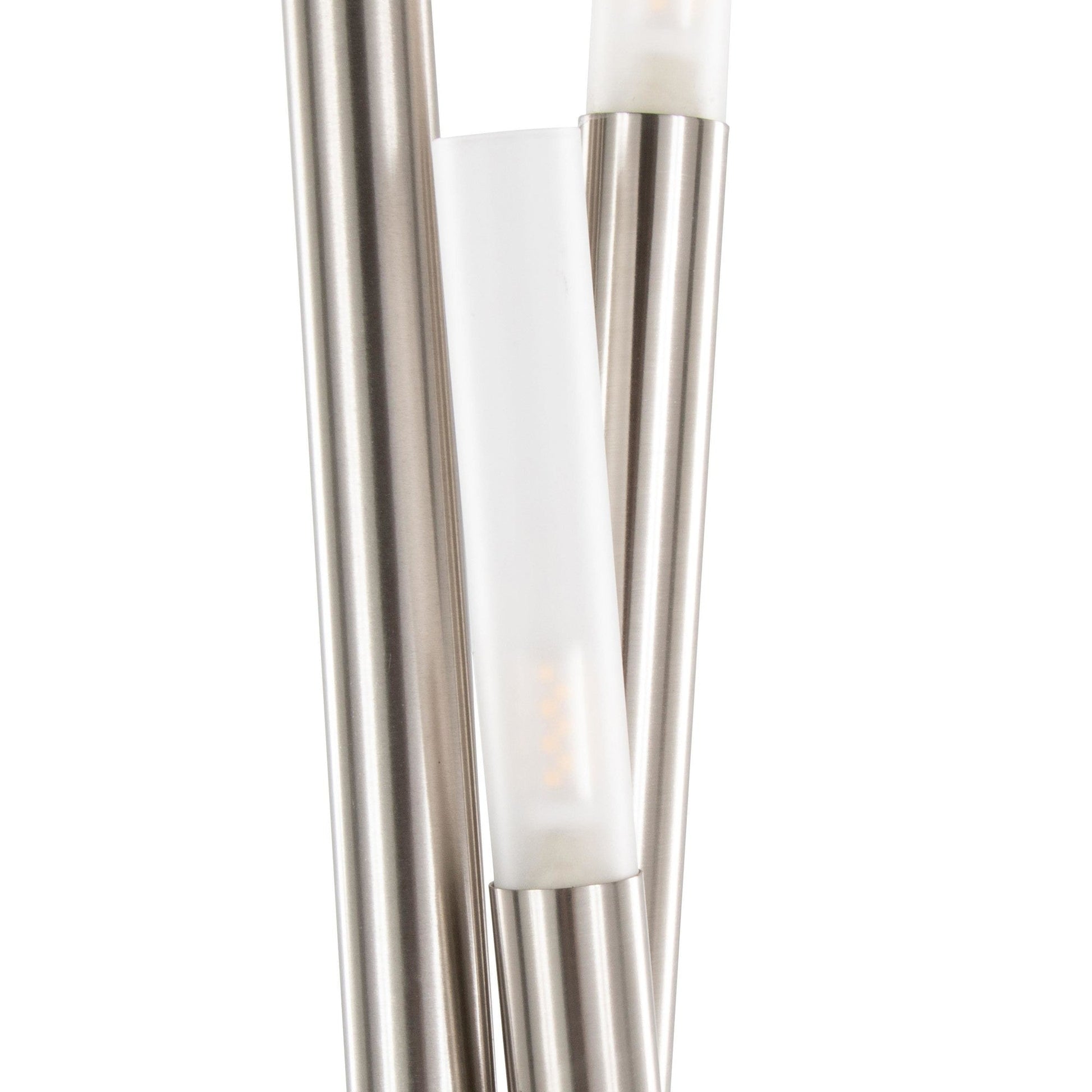 Cylindrical frosted sconces create a soft glow, accenting the modern design of the tubular metal arms of the Floor Lamp. If you like a subtle contemporary look, the Floor Lamp is the perfect choice. Uses 40W G9 halogen bulbs.