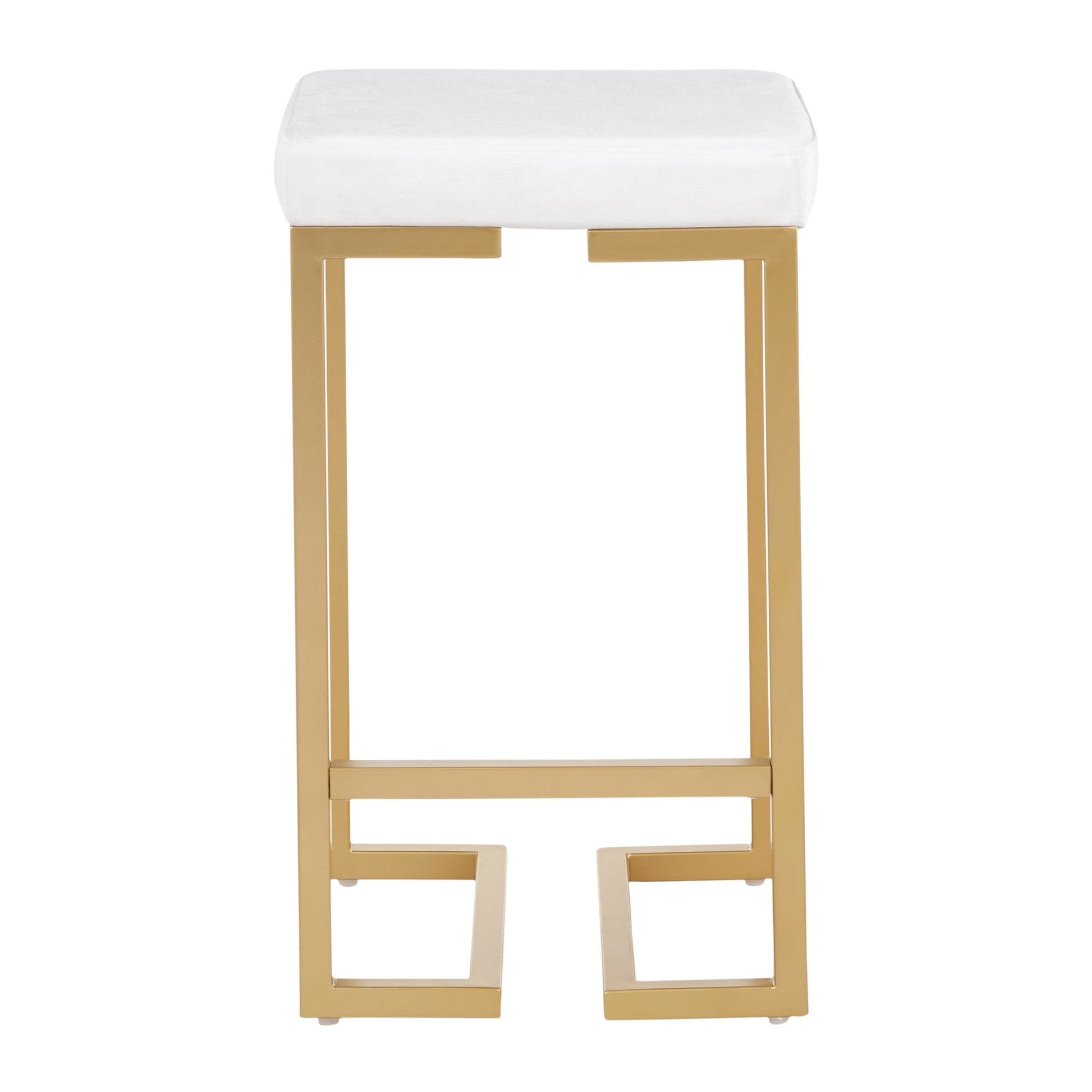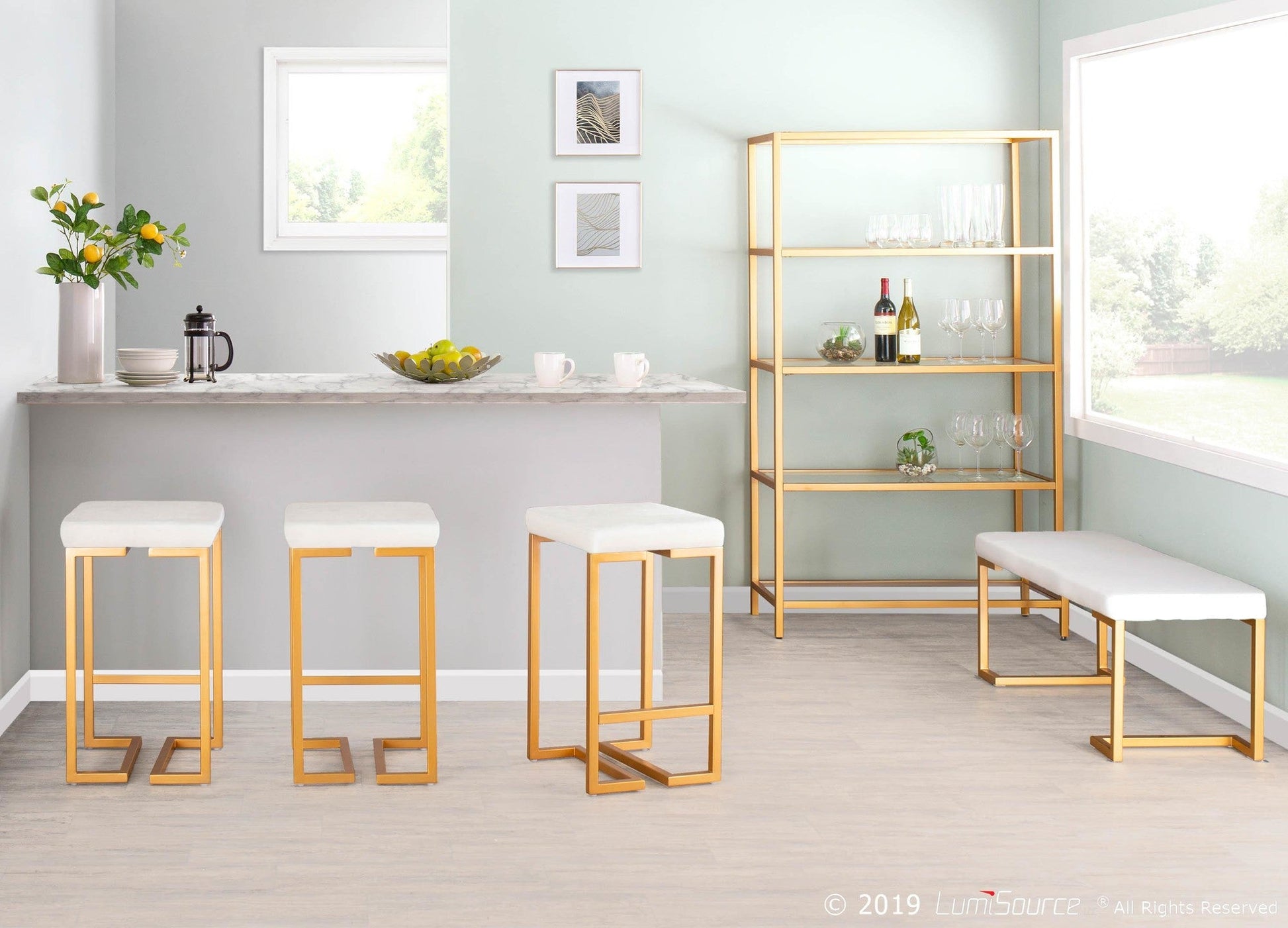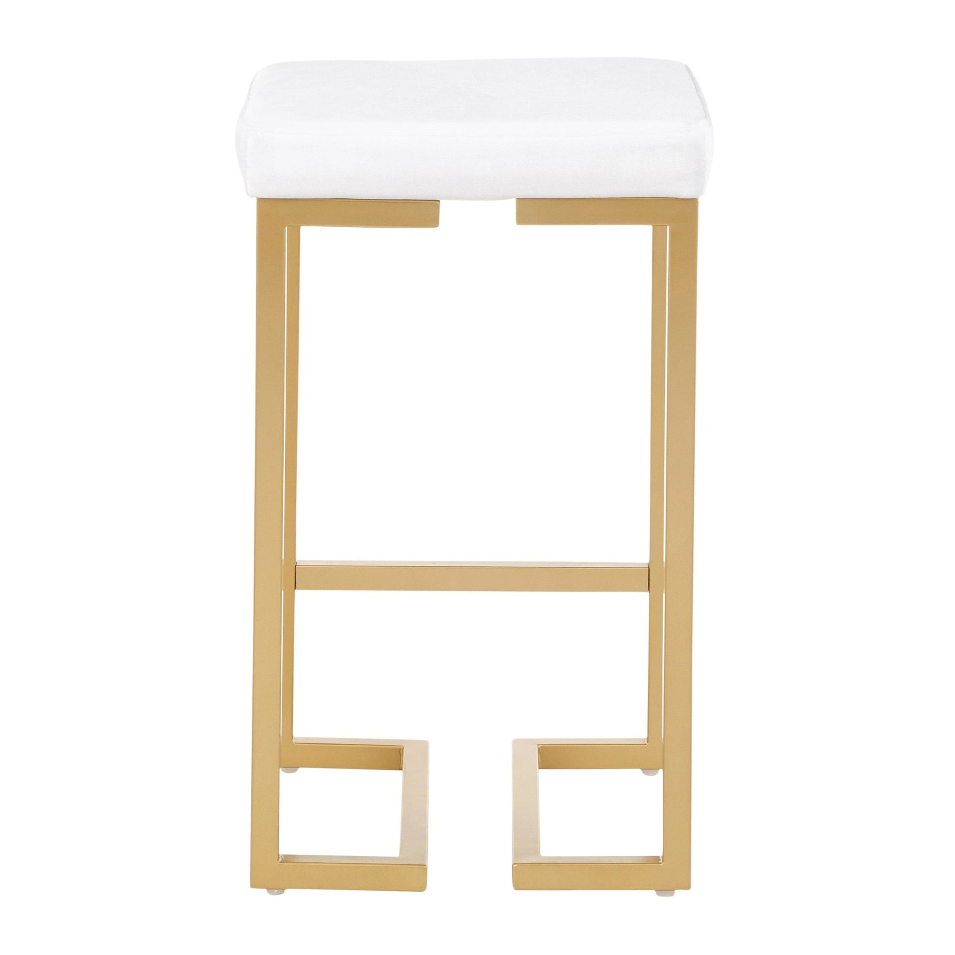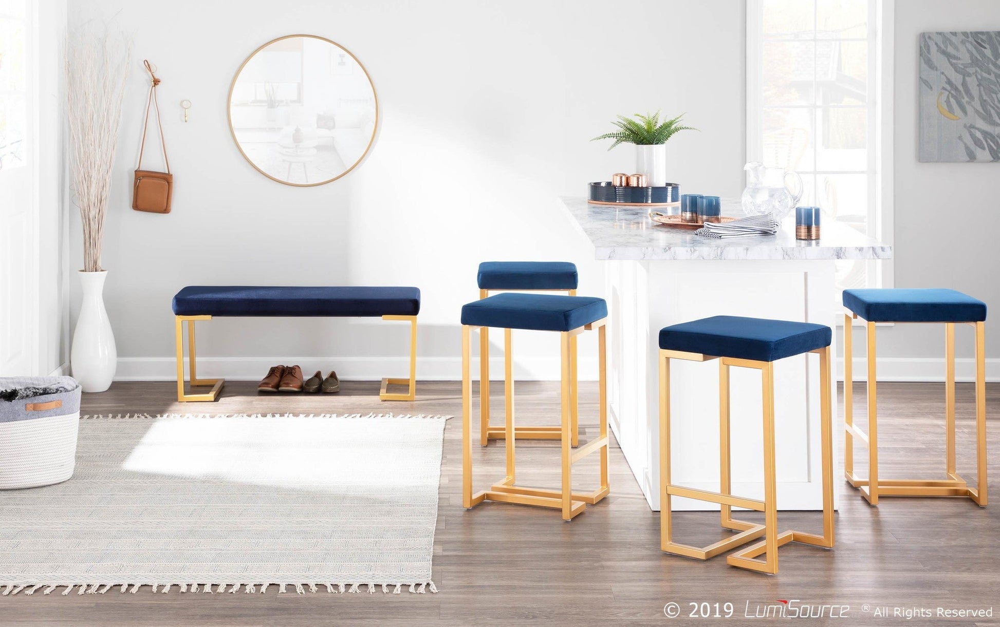 Glamorous and confidently contemporary, that's the Counter Stool. Featuring a chunky geometric gold frame, a conveniently placed footrest, and an elegant upholstered seat, this stool will enhance any dining space. Available in various color combinations, you choose the look that's right for you.