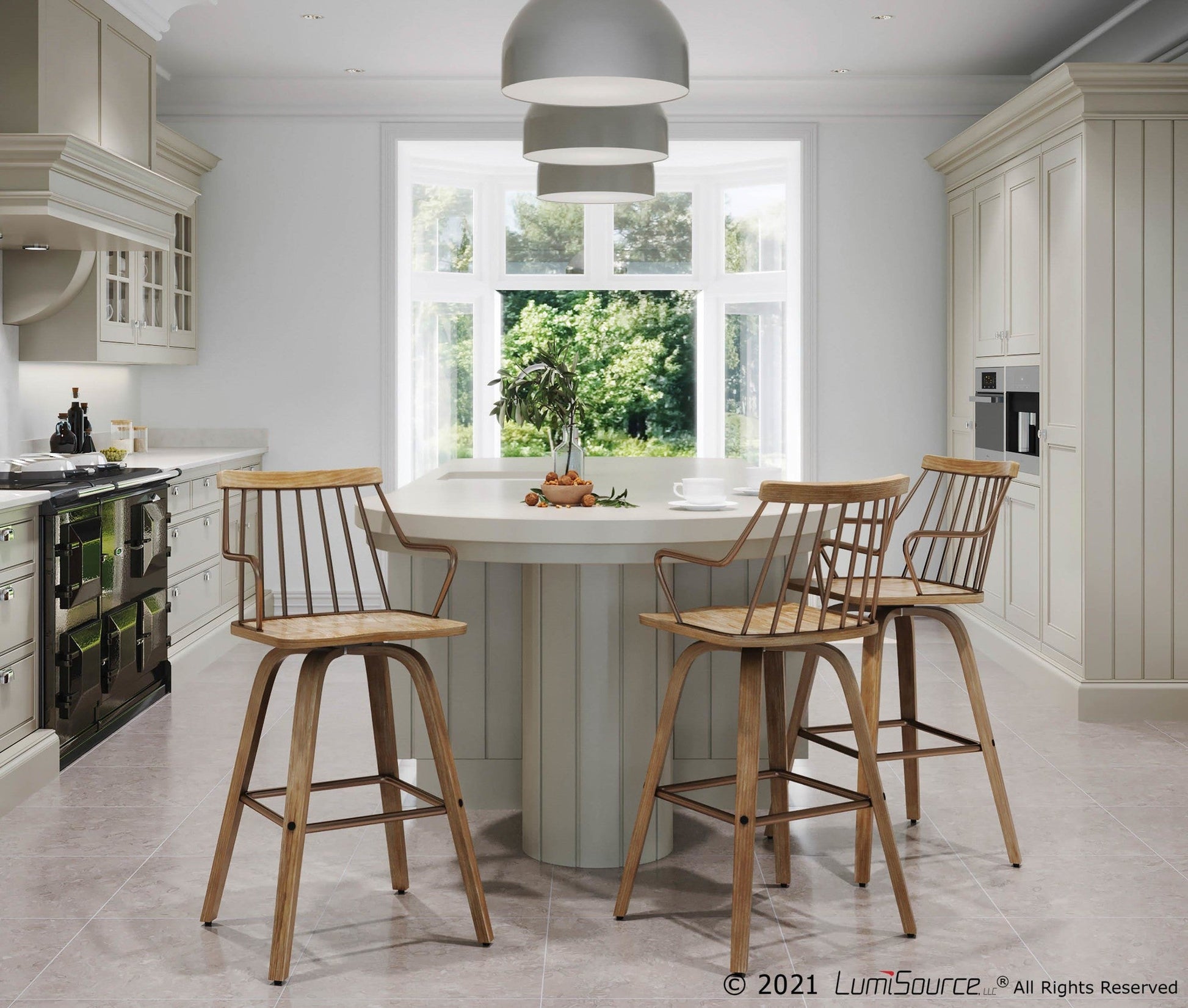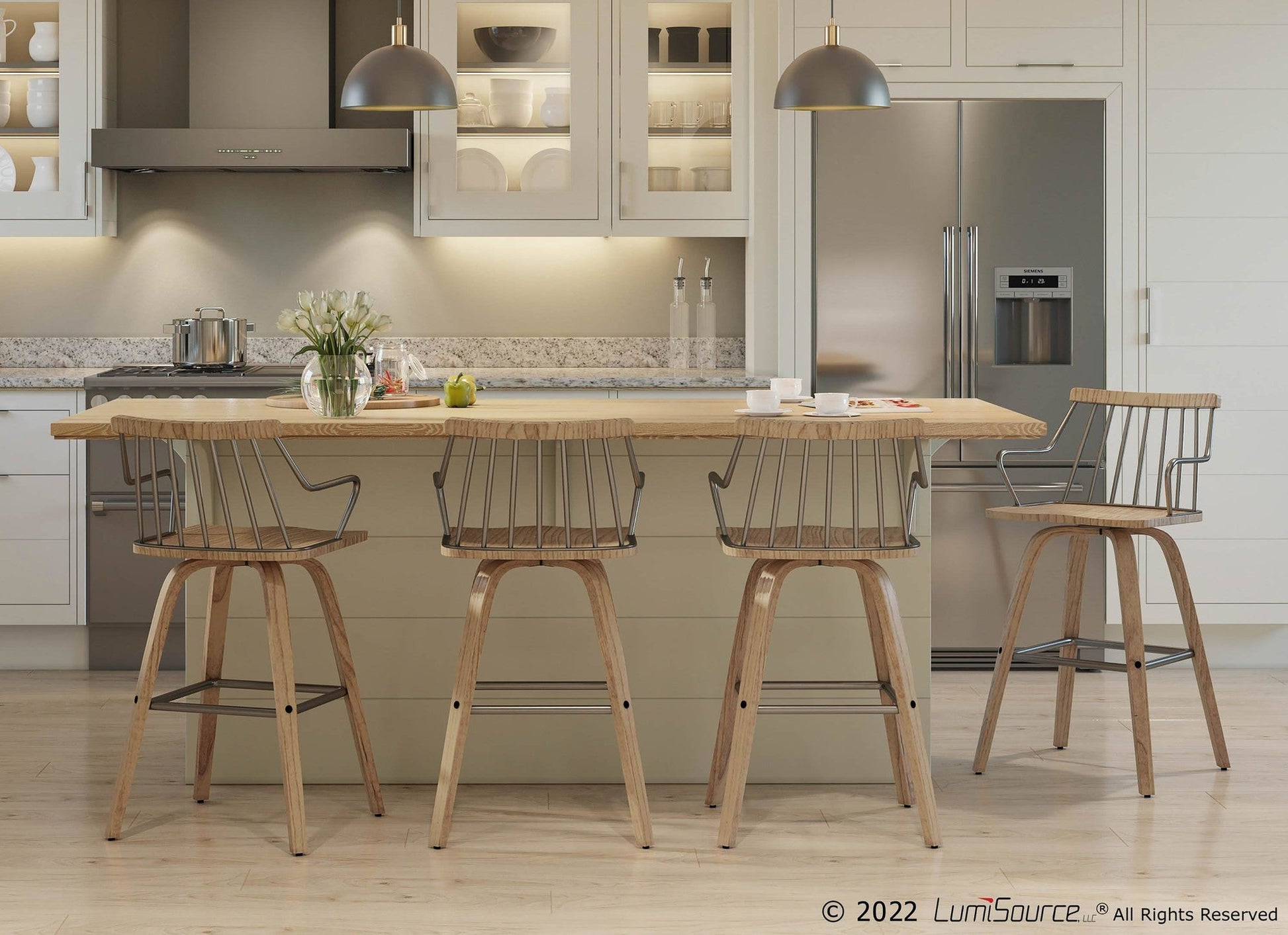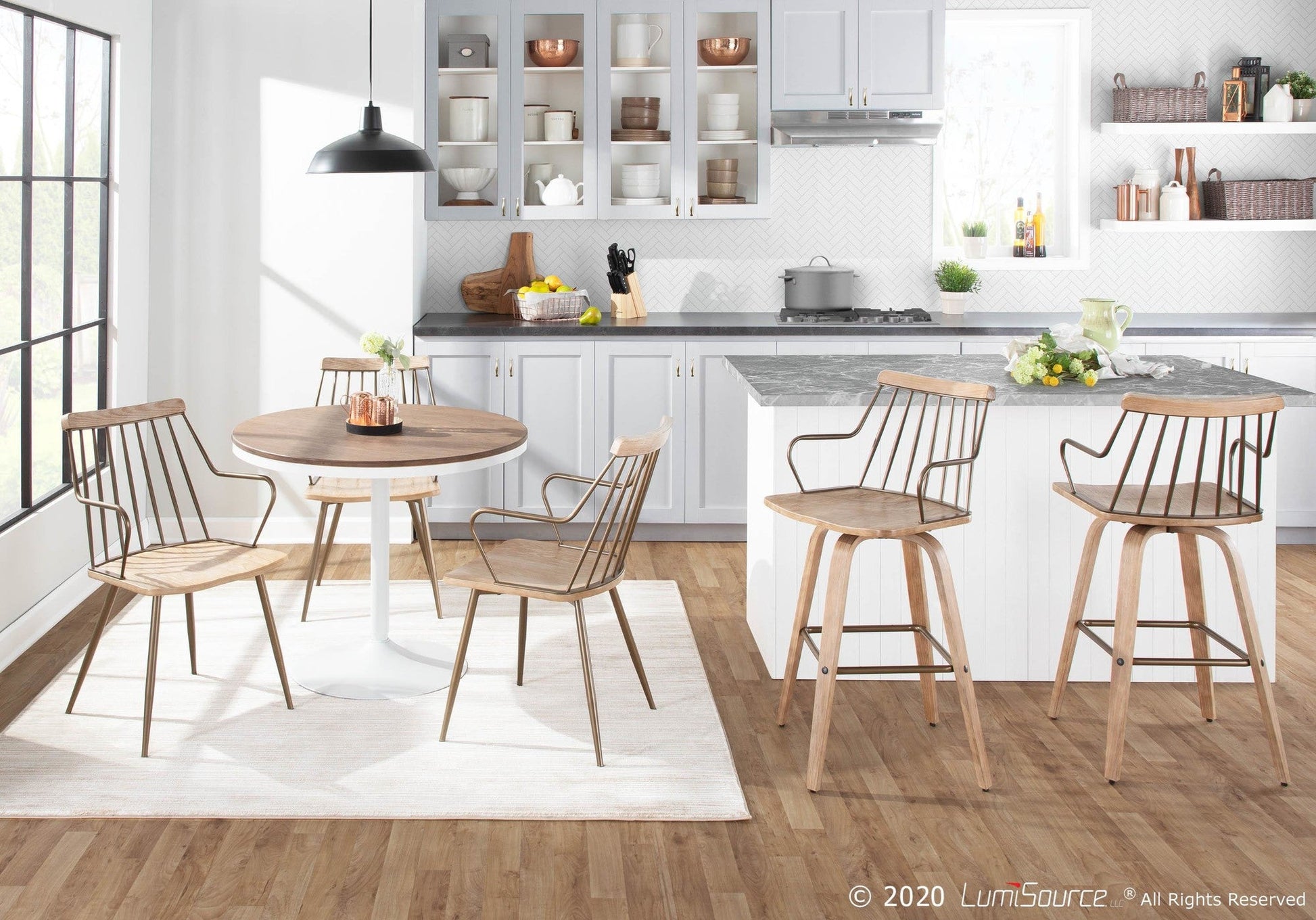 Perfect for your farmhouse inspired space, the Counter Stool features stylish white washed wood, a metal spindle backrest, and a swivel seat. Ultra versatile, the is great for use in any kitchen, bar, or break room.