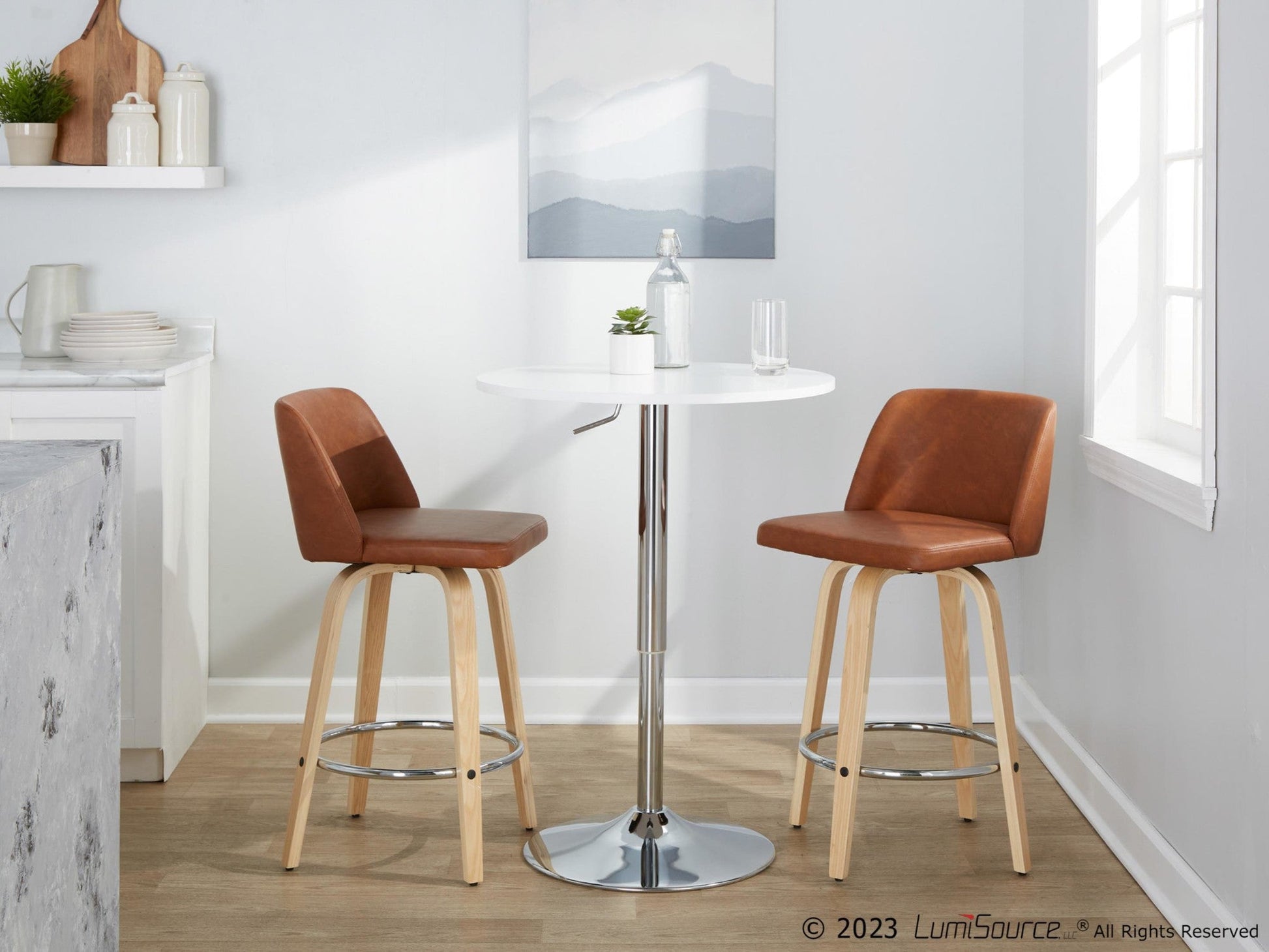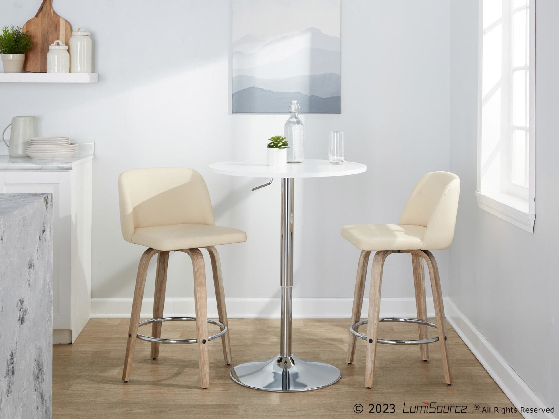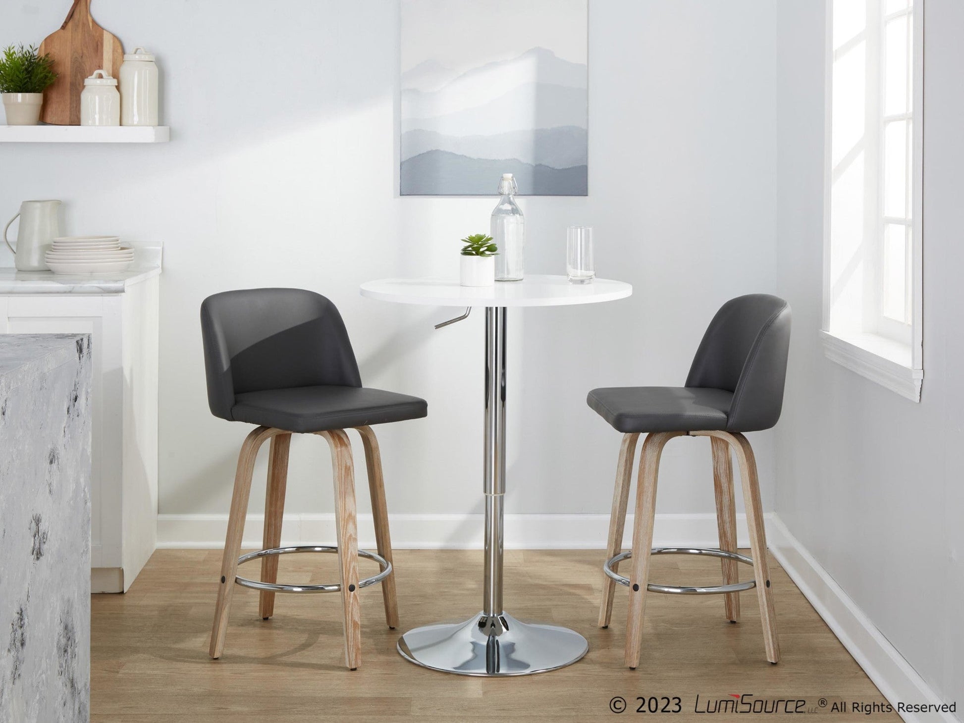 Includes two counter stools