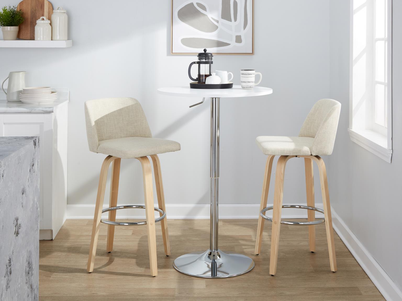 Comfort, modern simplicity, and classic lines define the appealing look of the Fixed-Height Barstool by Majestic Office Furniture. A padded upholstered swivel seat sits on fixed-height bent wood legs with a built-in footrest. Available in various colors, choose the one that suits your space best!